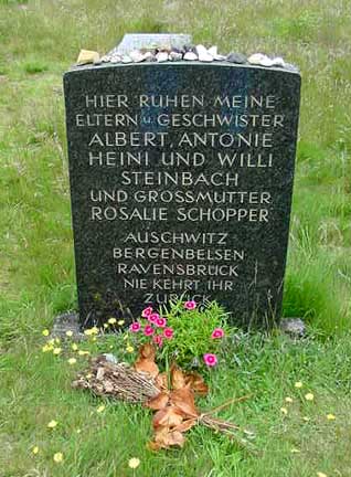 Bergen-Belsen Memorial Site![]() This wooden cross is a replica of one that was erected immediately after the liberation of the camp in honor of the priests and Catholic resistance fighters who died in the camp. According to the Museum, 20,000 of the 50,000 prisoners who died in the camp were non-Jewish. Up to 50,000 non-Jewish POWs also died in the camp. ![]() Memorial tombstone in honor of a Catholic priest who died in the camp. In the background is the Jewish Memorial and the obelisk. ![]() Mourners have left stones on this gravestone in honor of Ernst Brenner who died at Bergen-Belsen. A flower arrangement left weeks ago is still there. The memorial stone below is in honor of a family whose members died in Auschwitz, Ravensbrück and Bergen-Belsen. ![]() PreviousBack to Bergen-Belsen home pageHome