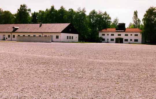 The building with the red-tiled roof in thebackground is the Jourhaus or gate house which was the only entranceto the Concentration Camp. The entrance through the gated archwayis large enough for an automobile to drive through. Notice theline of trees hiding the camp from the town residents. The groundsof the camp was originally a pine and fir forest which was clearedin order to build a munitions factory in World War I, which laterbecame the site of the Concentration Camp. The Roll Call Squarewas covered with gravel to prevent mud in the camp, accordingto Michael Selzer who wrote "Deliverance Day" aboutthe liberation of the camp.The prisoners would march across theAppellplatz (Roll Call Square) shown in the foreground, and outthrough the gate to work, often singing or marching to the accompanimentof music being played by the camp band. There were also workshopsin the camp. To see a picture of a Dachau prisoner at work, clickon the link below, or click on this picture to continue the VirtualTour.
