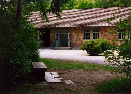 Baracke X (Barrack X in English) is the newcrematorium building built in 1942. One room houses the two doublecrematory ovens used for cremating the bodies of the dead prisoners.Other rooms were used as a mortuary and for disinfecting clothing.Also in this building is the gas chamber, disguised as a showerroom. Click on the link below to see an old picture with an earlierview of this building, then click on that picture to see a postcardpicture of this same building. Or you can click on the pictureabove to skip these black and white photos and continue the VirtualTour.