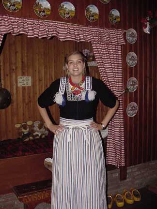 Woman in Dutch costume poses in front of built-in bed at cheese factory
