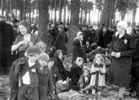 At the bottom of the map shown above, the train tracks can be seen going through an opening in the gate house on the left side of the drawing. Parallel to the tracks is the Hauptstrasse, or the main street of the camp. On the left side of the main street are the women's barracks with two disinfection chambers shown in orange in between the two sections of women's barracks. The photo below shows Hungarian Jews waiting in a Birch tree grove at the western end of the Birkenau camp on May 26, 1944. The Krema IV and Krema V gas chambers, disguised as shower rooms, are behind them, but out of camera range. These victims have been told that they are going to take a shower before being assigned to their barracks. They are standing across the road from the Sauna where there was a real shower room. The gassing of the Jews at Auschwitz-Birkenau was not a secret; all the prisoners eventually knew what was going on. The two largest gas chambers at Birkenau were inside barbed wire enclosures, on either side of the main camp road, within plain sight of the prisoners. The two smaller gas chambers were across the road from the Sauna building where incoming prisoners had to take a shower. In the movie Schindler's List, the women coming out of the shower building can see the smoke coming out of the tall chimney of Krema IV. Newcomers who inquired about their loved ones, who were missing, were told that they had gone "through the chimney." Elizabeth Mann, a survivor of Birkenau, said in a speech at the Simon Wiesenthal Center that when the Hungarian Jews were brought to Birkenau, beginning in late April 1944, the camp became so over-crowded that the prisoners were sleeping five to a bed and five prisoners were sharing one coffee cup. Mann said that the prisoners at Birkenau never knew whether water or gas was going to come out of the showerheads in the Sauna, where the women prisoners took showers; she also told an audience at the Simon Wiesenthal Center that the Nazis made soap out of the fat of dead Jews. Auschwitz-Birkenau did not start out as a death factory; it evolved over time. According to Holocaust historian Raul Hilberg: What began in 1941 was a process of destruction not planned in advance, not organized centrally by any agency. There was no blueprint and there was no budget for destructive measures. [These measures] were taken step by step, one step at a time. Thus came about not so much a plan being carried out, but an incredible meeting of minds, a consensus -- mind reading by a far-flung bureaucracy. Regarding Hitler's decision to exterminate the Jews, Holocaust historian Raul Hilberg told the French newspaper Le Monde des Livres the following on October 20, 2006: There was no pre-established guiding