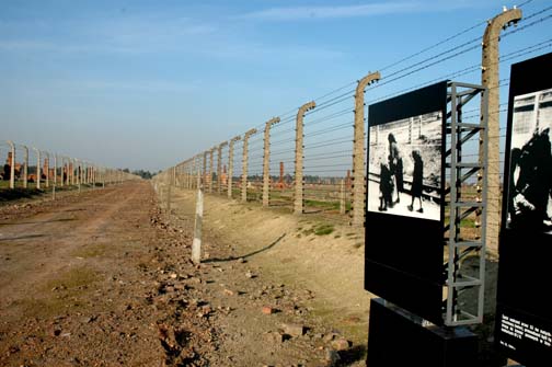 barbed wire fence around the Monowitz factories, and are also