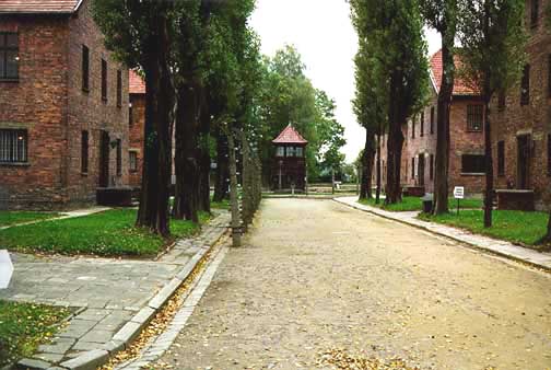 Camp Street and guard tower at Auschwitz