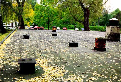 Four openings on gas chamber roof for pouring in Zyklon-B poison gas