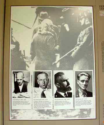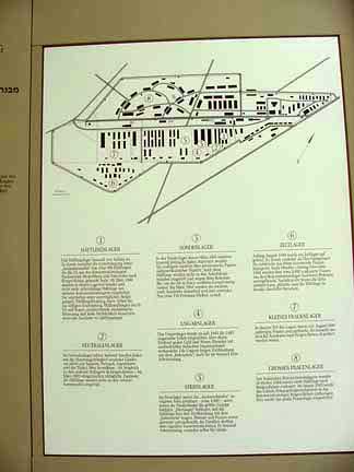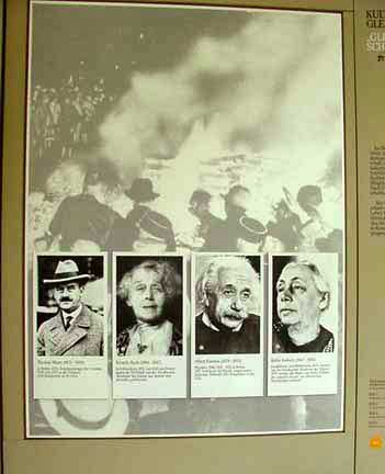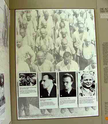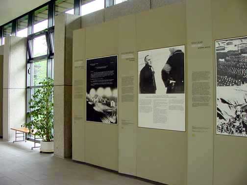 Bergen-Belsen Museum![]() A special section of the photo exhibits in the old Bergen-Belsen Museum was devoted to Nazi history and the persecution of the Jews and German citizens who opposed the Nazis. On October 28, 2007, a new Museum opened at the Bergen-Belsen Memorial Site. ![]() ![]() Photo exhibit shows a picture of political prisoners lined up for roll call at Dachau in the background with photos of anti-Fascists who opposed Hitler and the Third Reich. From the German point of view, these men were traitors to their country. ![]() Display shows the book burning in Germany in 1933 in the background with photos of Jews who fled Germany, including Albert Einstein. ![]() Exhibit shows a map of the camp, including the SS Training Camp which was right next to the Bergen-Belsen POW camp and exchange camp. PreviousHome |