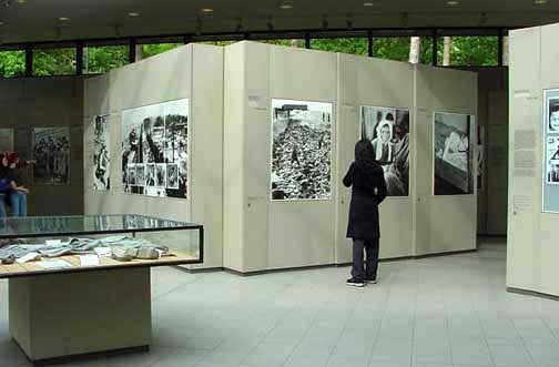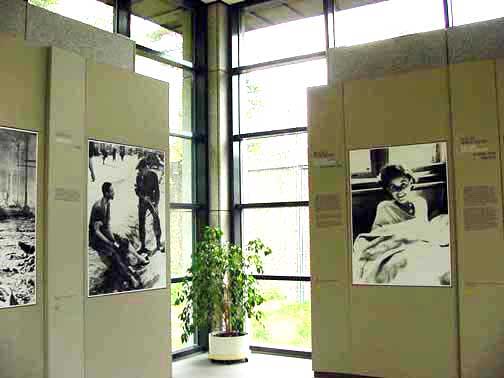 Germany has inaugurated a new museum at the site of the Nazi concentration camp where diarist Anne Frank died. The new exhibition centre at Bergen-Belsen, in the north of Germany, highlights the fates of those who died at the camp during World War II. Among the exhibits are the drawings and diaries of Jews imprisoned there, plus video statements by survivors. Some 100 survivors were at the ceremony at the camp, where an estimated 50,000 Jews perished during the Holocaust. Power of memory The new exhibition is part of an effort to reconstruct the lives of those sent to Bergen-Belsen during the Nazi occupation of Europe. It contains photographs, prisoners' records and objects donated by the survivors. Among the prominent survivors of Bergen-Belsen is Gerd Klestadt who was a child of eleven when he was sent to the exchange camp that opened at Bergen-Belsen in 1943. Klestadt's father died in the camp, but his mother and brother survived. Klestadt's grandmother was killed at the Sobibor death camp. Klestadt now lives in Luxembourg and frequently speaks about his ordeal at Bergen-Belsen to a new generation of students; he was not among approximately 100 survivors who were invited to attend the opening ceremony of the new museum. The photos below were taken at the old Bergen-Belsen museum. ![]() Display case shows striped clothes worn by some of the prisoners in the camp, and a pair of worn-out shoes made with wooden soles. ![]() In the lobby of the old Museum, there is a scale model of the former concentration camp. An aerial photo on the wall, taken by the British Air Force during World War II, shows the layout of the camp. A movie about the liberation of the camp is shown several times each day; the English version is shown at 3 p.m. Aerial photo on the wall in the lobby of the old Documentation Center and Museum shows the layout of the former camp, including the nearby SS garrison. Note the red dot on the bottom of the map which denotes the location of the viewer. The Memorial Site, on the grounds of the former camp, is located just above and to the left of the dot. ![]() Visitors typically dress in black when visiting a Holocaust memorial site. The exhibit photos about the Bergen-Belsen camp were in the front of the old Museum near the display case with camp shoes and uniforms. ![]() The old Documentation Center had lots of windows which provide natural lighting for the displays. Official Web Site for new ExhibitsContinueHome |