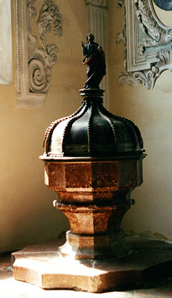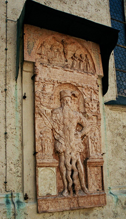 Parish Church of St. Stephan in Braunau am Inn![]() Adolf Hitler's father, Alois, and his mother, Klara Pölzl, were married in this church on 7 January 1885 at 6 o'clock in the morning. It was a quiet ceremony because Klara was already over four months pregnant; she was 24 and her new husband was 48. ![]() ![]() This carving on a church in Braunau am Inn, Austria depicts Hans Staininger, the man with the long beard, who became famous because of his beard down to his ankles. Another likeness of him is on the city hall. ![]() ![]() Adolf Hitler was baptized a Catholic with water from this holy font. As was customary in Germany and Austria, Hitler's baptismal name was Adolfus, the Latin word for Adolf. The name Adolf means noble wolf. His mother called him Adi. ContinuePreviousHome |