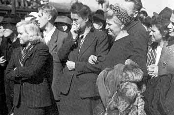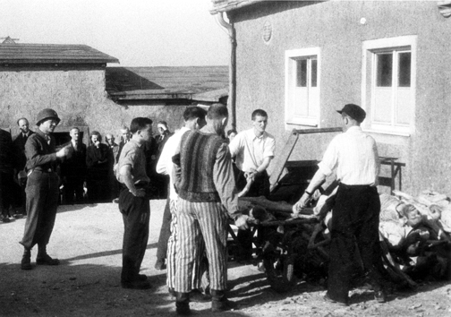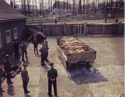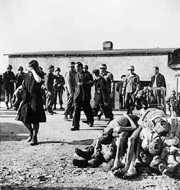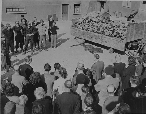 German civilians tour Buchenwald Camp![]() After the Buchenwald concentration camp was liberated on April 11, 1945, the political prisoners in the camp set up a tour of exhibits. On April 15, 1945, the German civilians from the nearby town of Weimar were brought to see the evidence of Nazi atrocities. Famous photographer Margaret Burke-White arrived at Buchenwald on the 15th of April, just as a procession of German townspeople entered the camp, according to the Buchenwald Report. Her shot of a German woman, wearing walking shoes and her Sunday dress, hiding her eyes in shame, was one of several that were published in Life magazine. Another photo taken by Burke-White is shown below. ![]() General George S. Patton wrote in his autobiography that the number of Weimar citizens brought to the camp was 1,500, although other accounts say it was 2,000. The German civilians had to march five miles up a steep hill, escorted by armed American soldiers. It took two days for the Weimar residents to file through the camp. No precautions were taken to protect them from the typhus epidemic in the camp. German citizens on their visit to Buchenwald are shown in this YouTube video. General Patton had visited the Ohrdruf sub-camp of Buchenwald on April 12, 1945 along with General Omar Bradley and General Dwight D. Eisenhower. On April 15, 1945, the day that he visited Buchenwald, General George S. Patton wrote the following in a letter to General Dwight D. Eisenhower: We have found at a place four miles north of WEIMAR a similar camp, only much worse. The normal population was 25,000, and they died at the rate of about a hundred a day. The burning arrangements, according to General Gay and Colonel Codman who visited it yesterday, were far superior to those they had at OHRDRUF. I told the press to go up there and see it, and then write as much about it as they could. I also called General Bradley last night and suggested that you send selected individuals from the upper strata of the press to look at it, so that you can build another page of the necessary evidence as to the brutality of the Germans. General Eisenhower did not visit Buchenwald himself, but he did follow General Patton's advice to "build another page" about the"brutality of the Germans." A group of "upper strata" reporters were flown to Germany, arriving at Buchenwald on April 24, 1945, and given the grand tour of the Buchenwald atrocities. The photo below shows one of the barrack buildings that had exhibits prepared for visitors. A few of the Jewish survivors, wearing their striped prison uniforms, sat at a table in one of the barracks, ready to confront the German civilians with stories of what they had suffered at the hands of the Nazis. There were 4,000 Jews in the Buchenwald camp when the American liberators arrived, and most of them had previously been at Auschwitz or other camps in the east. "We didn't know." This was what the German civilian population would say over and over again about the concentration camps in the coming months. The American army was determined that the ordinary German people should see the depths of depravity to which their Nazis leaders had sunk. ![]() ![]() At his trial before an American Military Tribunal at Dachau, after the war, the last Commandant of Buchenwald, Hermann Pister, claimed that there were no bodies "lying around" when the camp was liberated. The photo above, taken a week after the camp was liberated, shows a wagon loaded with corpses outside the Buchenwald crematorium. Pister claimed that the bodies on display were those of prisoners who died after the camp was liberated. (In the background of the photo is the camp zoo with a cave for the bears.) In the photo below, famous photographer Margaret Bourke-White takes a reading with a light meter in preparation for photographing a group of German civilians who are being brought to see a wagon load of corpses. This photo was taken on April 16th, the second day that a group of German civilians were brought from Weimar to see the bodies of the typhus victims. ![]() The two photos immediately above are from the collection of Lt. Col. Parke O. Yingst, Commander of the 281st Combat Engineers Battalion, who arrived at Buchenwald after the camp was liberated. ![]() The first news reel film about the German war crimes, that was shown in American theaters near the end of the war, included some scenes of German civilians, being forced to "atone" for what their countrymen did, by burying the bodies found in the camp. One of the crematory ovens was shown with the body of a prisoner in a striped uniform visible inside, as the narrator said that prisoners had been "burned alive" at Buchenwald. The narrator of the film said that what the Americans found at Buchenwald had "changed the name of Germany to infamy." It took years of rehabilitation by the Allies before the German people turned against the Third Reich and Adolf Hitler, "the people's Chancellor," whom they had once worshiped. Now the Germans look upon their defeat in World War II as their liberation from the Nazis. The year 2005 marked the 60ieth anniversary of the liberation of the Nazi concentration camps and ceremonies took place at many of the former camps to mark the dates, so that the horror will never be forgotten. The following quote is from a CBS news story in 2005 about the anniversary ceremony at Buchenwald: About 1,000 people gathered in a cold drizzle as German Chancellor Gerhard Schroeder and camp survivors observed a minute of silence and placed flowers where prisoners were forced to assemble. Earlier, Schroeder expressed shame in Germany's name and honored the victims in a ceremony at Weimar's National Theater, a symbol of the city's classical cultural heritage."They fell victim to hunger, sickness, the sadistic terror and systematic murder," Schroeder said in a speech. "I bow before you, the victims and their families." [...] The official ceremony was part of a weekend of commemorations. It