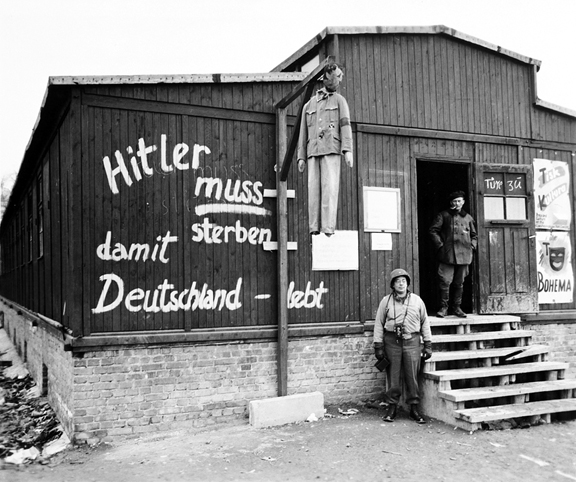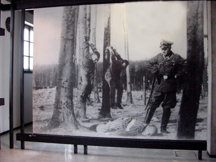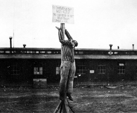 Exhibits put up by prisoners after the Buchenwald concentration camp was liberatedA display table put up by the Buchenwald prisoners, shown in the photo below, featured a lamp shade allegedly made from human skin, two shrunken heads allegedly made from the severed heads of two Polish prisoners, an ashtray made from a human pelvis bone, and several pieces of human skin with tattoos. Note the man in the center of the photo who is still wearing his prisoner's badge with a red triangle, indicating a political prisoner. ![]() A series of videos about Buchenwald on this web site includes a video about the display in the photo above. ![]() The photo above is an exhibit that was set up inside the morgue at Buchenwald. At Dachau, the dead bodies of prisoners were hung from pulleys above the ovens so that the bodies would remain straight before rigor mortis set in. At Buchenwald, the morgue was allegedly used as an execution room where live prisoners were hung from hooks on the wall until they were dead. In the photo, there is a hook on the wall above the head of what looks like a dummy dressed in a prisoner's uniform. In the corner is what looks like a club; perhaps this is the "bloodstained club" that was found in the morgue by the liberators, according to the Buchenwald Report. Note the marks on the wall, which could be the "heel marks" that one of the American liberators reported seeing. According to the Buchenwald Museum, the youngest prisoner who was executed at Buchenald by hanging from a hook in the morgue was eight years old, although Germany had a law that prohibited the execution of prisoners below the age of sixteen. The Buchenwald camp also had a gallows where prisoners who were condemned to death were hung. It was customary for the Nazis to send criminals who had been convicted in a court of law to the nearest concentration camp to be executed. ![]() The photo above, taken after the camp was liberated, shows an American soldier with a camera around his neck and a well-dressed prisoner standing at the entrance which has a sign that reminds visitors to shut the door. The translation of the words on the wall of the building read: "Hitler must die so that Germany can live." On April 30, 1945, the prisoners got their wish when Hitler committed suicide. The display in the photo below depicts the punishment called "tree hanging," which was devised by Martin Sommer, the SS officer who was in charge of the bunker, or the camp prison. This punishment was reserved for serious offenses such as sabotage in the factories at Buchenwald, where the prisoners were forced to work. It was discontinued in 1942 by order of Reichsführer Heinrich Himmler, who was the head of all the concentration camps. ![]() ![]() The words on the sign, shown in the photo above, are "Ein Strafvollzug der Nazi-Kultur: Das sogenannte an den Baum hängen." The last two words are illegible. The English translation is "A Punishment of Nazi Culture: The so-called hanging on a tree." Martin Sommer, the alleged innovator of this cruel punishment, was put on trial by SS officer Dr. Georg Konrad Morgen in a Nazi court in 1943 at the same time that Buchenwald Commandant Karl Otto Koch and his wife Ilse were put on trial by the Nazis for embezzlement and abuse of the prisoners at Buchenwald. After the trial, Sommer was transferred to the Russian front where he was wounded in action. Sommer was again tried by a West German court in 1958. Sommer, who was a paraplegic as a result of war wounds, was convicted of the murder of 25 Buchenwald prisoners by injection and was sentenced to life in prison. ![]() The photo below was taken in the Museum at Dachau in May 2001. The photo, which is a recreation of the tree hanging punishment at Buchenwald, is not included in the new Museum at Dachau which opened in May 2003. ![]() According to Harold Marcuse, Professor of History at the University of California at Santa Barbara, this scene was created in 1958 for an East German DEFA film, which is why the photo is no longer used. Reference: H. Obenaus, "Das Foto vom Baumhängen: Ein Bild geht um die Welt," in Stiftung Topographie des Terrors Berlin (ed.), Gedenkstätten-Rundbrief no. 68, Berlin, October 1995, pp. 3-8. More exhibits at BuchenwaldBuchenwald OrphansCongressmen & ReportersEdward R. Murrow ReportLiberation ClaimsLiberation DayBuchenwald SurvivorsGerman civilians tour BuchenwaldBack to Buchenwald LiberationHomeThis page was last updated on June 25, 2010 |
