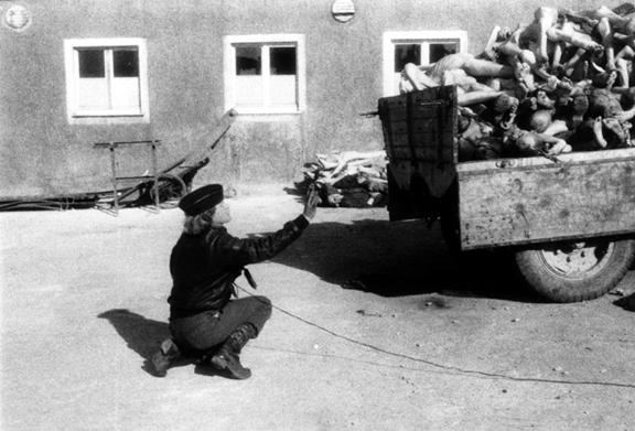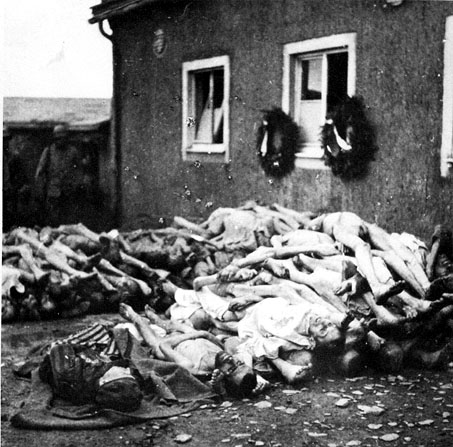 and he added, "We're very efficient here.? ![]() Murrow's broadcast continued with this description of the dead bodies on display: We went again to the courtyard, and as we walked we talked. The two doctors, the Frenchman and the Czech, agreed that about six thousand had died during March. Kersheimer, the German, added that back in the winter of 1939, when the Poles began to arrive without winter clothing, they died at the rate of approximately nine hundred a day. Five different men asserted that Buchenwald was the best concentration camp in Germany; they had some experience with the others. On the day of Murrow's broadcast, the American Army had not yet released the death records that they had confiscated from the camp. According to a U.S. Army report dated May 25, 1945, there was a total of 238,980 prisoners sent to Buchenwald during its 8-year history from July 1937 to April 11, 1945, and a total of 34,375 prisoners died in the camp. During March 1945 and the first 11 days in April, there had been 913 deaths, not 6,000 as the two doctors told Murrow. A U.S. Army Intelligence report, dated April 24, 1945, put the Buchenwald death toll at 32,705. A later U.S. Government report in June, 1945 put the total deaths at 33,462 with 20,000 of the deaths in the final months of the war. The International Tracing Service at Arolsen, an affiliate of the Red Cross, released a report in 1984 which said that the number of documented deaths in Buchenwald was 20,671 plus an additional 7,463 at the notorious satellite camp called Dora, where prisoners were forced to work underground in the manufacturing of V-2 rockets for the German military. (In October 1944, Dora became an independent camp named Nordhausen.) According to an information booklet, which I obtained from the Buchenwald Memorial Site, records kept by the camp secretary show that there were 48 deaths in 1937, the year that the Buchenwald camp opened. In 1938, there were 771 deaths and in 1939, there were 1235 deaths. In 1940 the deaths increased to 1772, but in 1941 the deaths decreased to 1522. These figures indicate an increase in the deaths during the winter of 1939-1940, but no where near 900 per day, as the Communist survivors told Murrow. ![]() Murrow's broadcast continued with this description of the courtyard, shown in the photo above: Dr. Heller, the Czech, asked if I would care to see the crematorium. He said it wouldn't be very interesting because the Germans had run out of coke some days ago and had taken to dumping the bodies into a great hole nearby. Professor Richer said perhaps I would care to see the small courtyard. I said yes. He turned and told the children to stay behind. . . . We proceeded to the small courtyard. The wall was about eight feet high; it adjoined what had been a stable or garage. We entered it. It was floored with concrete. There were two rows of bodies stacked up like cordwood. They were thin and very white. Some of the bodies were terribly bruised, though there seemed to be little flesh to bruise. Some had been shot through the head, but they bled but little. All except two were naked. I tried to count them as best I could and arrived at the conclusion that all that was mortal of more than five hundred men and boys lay there in two neat piles. There was a German trailer which must