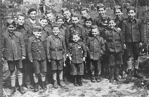 Europe. Men from the countries that made America. ![]() It was cold in Germany in April 1945 and all the prisoners were wearing coats, including the children. Only the Jewish prisoners at the Auschwitz death camp had their prison number tattooed on their arm. The Buchenwald children with tattoos were Jewish children who had been transferred to Buchenwald from Auschwitz in what is now Poland when it was abandoned by the Nazis on January 18, 1945. Other children in Buchenwald were orphans who had been there for several years; a baby had been born in the camp in 1944. Most of the children were teenagers; only 30 of the 904 children in the camp were under 13 years of age. The youngest was 4 years old. If Eleanor Roosevelt, the wife of President Franklin D. Roosevelt, had had her way, the children at Buchenwald would have been living in America in 1945. Mrs. Roosevelt went before the American Congress and tried to persuade them to pass the Child Refugee Bill which would have allowed 10,000 Jewish children a year, for two years, to enter the United States above the usual quota for German immigrants, but Congress refused to pass the bill. Continuing his broadcast, Murrow reported: We went to the hospital. It was full. The doctor told me that 200 had died the day before. I asked the cause of death. He shrugged and said: "tuberculosis, starvation, fatigue and there are many who have no desire to live. It is very difficult." Dr. Heller pulled back the blanket from a man's feet to show me how swollen they were. The man was dead. Most of the patients could not move. There was a typhus epidemic in the Buchenwald camp and 13,056 prisoners had died of typhus just during the months of January and February 1945. At the height of the epidemic, the prisoners were dying at the rate of 222 per day, but in the last six weeks that the camp was in operation there had been only 913 deaths, according to camp records found by the US Army. If 200 prisoners died on April 11th, the day that the first American soldiers arrived, it might have been because they got sick from the rich food given to them by the Americans. Elie Wiesel, Buchenwald's most famous survivor, wrote in his book "Night" that on April 14th "three days after the liberation of Buchenwald, I became very ill with food poisoning. I was transferred to the hospital and spent two weeks between life and death." A German Communist prisoner, who told Murrow that he had been at Buchenwald for 9 years, which was one year longer than the camp had been in existence, escorted him around the kitchen. This was the second prisoner who had survived for more years that the camp had been in operation. Murrow's words are quoted below: I asked to see the kitchen. It was