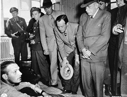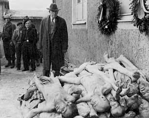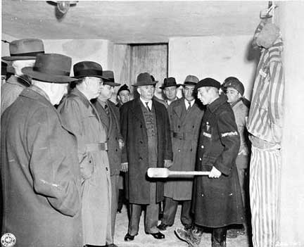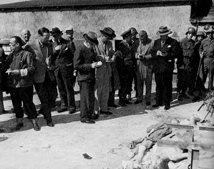 Congressmen & Reporters visit Buchenwald![]() After the liberation of Buchenwald on April 11, 1945, the rotting corpses were left unburied until General Dwight D. Eisenhower could arrange for a contingent of American congressmen and a group of newsmen, led by Joseph Pulitzer of the St. Louis Post Dispatch, to fly to Germany to view the camp on April 24, 1945. By then, the original naked corpses had been left out in the sun and the rain for almost two weeks. The shortage of food and the typhus epidemic in the camp had resulted in so many deaths before the liberation of the camp that the crematorium ovens could not keep up with disposing of the bodies. Since the liberation, the epidemic had not abated and more sick prisoners were dying each day, although some were dying from eating too much of the rich food given to them by the Americans. Their bodies were added to the pile, so that by the time that the Congressmen and the newsmen got there, there were many more corpses. ![]() ![]() ![]() ![]() ![]() The newspaper reporters in the photo above are, from left to right: Norman Chandler of the L.A. Times, William I. Nichols of This Week Magazine and Julius Ochs Adler of the New York Times. They are interviewing a survivor who is in the hospital at Buchenwald. In his book, "Ike the Soldier: As They Knew Him," Merle Miller quotes Eisenhower's speech on April 25, 1945 to members of Congress and Journalists who had been shown Buchenwald on the day before: You saw only one camp yesterday. There are many others. Your responsibilities, I believe, extend into a great field, and informing the people at home of things like these atrocities is one of them....Nothing is covered up. We have nothing to conceal. The barbarous treatment these people received in the German concentration camps is almost unbelievable. I want you to see for yourself and be spokesmen for the United States. If Ike ever visited Buchenwald himself, he neglected to mention it in his own book, "Crusade in Europe." The only "horror camp" in Germany that he mentioned in his book was Ohrdruf, a sub-camp of Buchenwald which he visited on April 12, 1945. Edward R. Murrow ReportLiberation ClaimsLiberation DayFirst American liberatorsGerman civilians tour BuchenwaldExhibits put up by prisonersMore exhibits at BuchenwaldBuchenwald OrphansOld photos of BuchenwaldBuchenwald SurvivorsBack to Buchenwald liberationHomeThis page was last updated on April 14, 2008 |