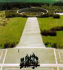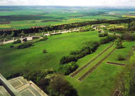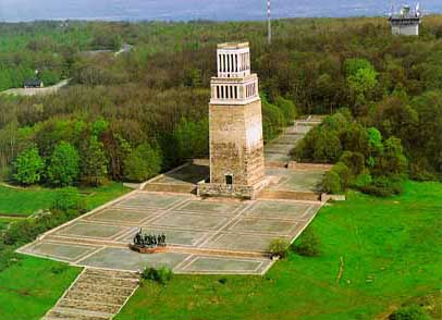 Memorials to the Dead at Buchenwald![]() The photograph above shows the bell tower at the Buchenwald Monument with a sculpture in front of it, created by Fritz Cremer to honor the Anti-Fascist resistance fighters who were imprisoned in the Buchenwald concentration camp. The bell tower is located on top of the Ettersberg hill, about one kilometer from the Memorial Site at the former camp. Throughout the Buchenwald Memorial site, there is heavy emphasis on the Communist and Social Democrat political prisoners with virtually no mention of the 4,000 Jews who were in the camp when it was liberated. One of the first monuments to be erected at a former concentration camp, the Buchenwald Monument is a political statement by the Communists, not a Holocaust memorial. The Buchenwald concentration camp was primarily a camp for political prisoners who opposed the Nazis, not a death camp for the genocide of the Jews. Most of the Jews in the camp had only recently arrived, after being transferred to Buchenwald when the death camps in the East were abandoned as the army of the Soviet Union advanced across German-occupied Poland. The Buchenwald Monument is a huge affair on the southern slope of Ettersberg hill overlooking the city of Weimar, as the aerial photo below shows. The construction of this elaborate monument required four years; it was finally dedicated on September 14, 1958. Inside the tower is a bronze plaque under which dirt from many other Nazi concentration camps was placed. A bronze bell in the tower rings every hour on the hour. ![]() The camp is on the northern slope of the hill, but not visible in the photo above. The white building north of the tower, shown in the photo above, is the Ettersburg castle. The three circles in the foreground (one is partially hidden by trees) are the walls built around natural depressions in the ground called "Devils's Holes." ![]() ![]() From the end of 1944 until the end of March 1945, the SS used these craters to dump the ashes of the dead after the bodies were cremated. According to the camp guidebook, these "ring tombs" are the graveyard for more than 3,000 inmates of the Buchenwald camp. The entrance to the monument starts with a path to the right of the parking lot in the former concentration camp. This path follows the road for about one kilometer. After you enter, you walk on a path called the Street of Nations, shown in the picture below. ![]() Each stelae records a different period or episode of suffering and resistance in the Buchenwald camp and has a poem engraved on the other side. The Street of Nations connects the three ring tombs, as shown in the foreground of the aerial photo above. The 18 stone pillars represent the nations from which the camp prisoners came. Some of these nations are no longer in existence. At the third ring tomb, you turn and climb the steps, which are not very steep, to the top where the bell tower stands. The bell tower is shown in the photograph below. At this point you will be a few feet from the main road and the Glockenturm bus stop, where you can catch the bus back to Weimar. The whole tour of the monument, starting from the camp, will take at least an hour. ![]() The Bell Tower stands at an overlook with a magnificent view of the city of Weimar. This is the spot where an important German historical landmark, the Bismarck Tower, once stood. The SS guards from the Buchenwald camp used to unwind by having drinking parties at this place. The inmates who had died in the camp after the liberation were also buried in mass graves near the Bismarck Tower, as shown in the old photo below. The Bismarck Tower was named after Otto von Bismarck, who was a great hero to the German people. He was the equivalent of George Washington for Americans, since he was recognized as the father of his country. Bismarck, who had been appointed the Chancellor of Prussia by the King of Prussia in 1862, was credited with uniting all the German states into one country in 1871, under Kaiser Wilhelm I, who also retained his original title of King of Prussia. The Social Democrat Party (Sozialdemokratische Partei Deutschlands) split off from the Communist Party in Germany in 1875 and formed a new political party. Bismarck suppressed the Social Democrats with the Anti-Socialist Laws of 1878. He was Germany's greatest hero, but he was also the greatest enemy of the Social Democrats and the Communists. So it was inevitable that, in 1949, the Soviets would blow up the tower named after him, and replace it with their own memorial tower dedicated to the Communist and Social Democrats resistance fighters. In 1949, Germany was split into two countries because of political differences between the Soviet Union and the other three Allied countries. On Oct. 7, 1949 the Soviet-occupied zone in East Germany became the German Democratic Republic, also known as "East Germany." The Social Democrats and Communists combined into one political party called the SED or Socialist Unity Party (Sozialistische Einbeitspartei Deutschlands). When the Bismarck tower was demolished by the Soviet Union in 1949, there were 1286 small urns containing ashes of Buchenwald inmates found in the basement. They were buried in the "row of tombs" to the left of the tower. During the 40 years of the Communist German Democratic Republic, the grounds around the tower were used for mass meetings, flag-hoisting and military swearing-in ceremonies. ![]() The first monument at Buchenwald, shown in the black and white photo above, was erected in April 1945, only 8 days after the camp was liberated. The letters K.L.B. stand for Konzentratzionslager Buchenwald, which was the German name for the Buchenwald Concentration camp. The political prisoners held a mourning ceremony near the gate house where they had constructed an obelisk in honor of the resistance fighters; the Jewish prisoners, who were a minority in the camp, were not invited. At the ceremony, the political prisoners estimated the numb