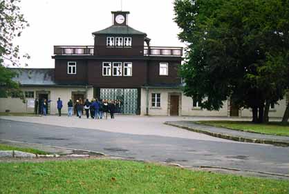 Road into Buchenwald Concentraion Camp![]() The photo above shows the library, housed in a former SS administration building, located to the right of the cafeteria at the entrace to the Memorial Site. A sign directs tourists to a path which goes around the corner of this building and leads to the site of the railroad station. The route to the monument also starts around the corner of the building shown above. When the camp was in operation, there were fancy street signs which named the roads and pointed the way to the Zoo and other places in the camp. The photo below shows the site where the railroad station formerly stood. At this spot, you will see a sign which directs you to the road to the right if you want to take a 20-minute walk to the entrance to the monument. You can also get off at the Glockenturm bus stop on your way back to Weimar and avoid the long walk. ![]() The road to the left of the railroad station takes you into the camp the same way the prisoners entered more than 50 years ago on a road called Carachoweg (Caracho Way). The Spanish word caracho was prison slang for double time. There were a few "Red Spaniards," or Communists that had fought the Fascists in the Spanish Civil War, who were imprisoned at Buchenwald. Note the Buchenwald gatehouse on the right in the background of the photo below. ![]() Buchenwald became the third major camp in the German concentration camp system on June 3, 1936, when the Inspector of the Concentration Camps, SS General Theodor Eicke, proposed to transfer the concentration camp of Lichtenburg near Berlin to Thuringia, a state in central Germany. The wooded hill called the Ettersberg was officially chosen as the site of the camp on May 5, 1937 and on July 16, 1937, the first 300 prisoners arrived in the camp. Initially the name of the camp was Konzentrationslager Ettersberg but on August 6, 1937, the name was changed to Konzentrationslager Buchenwald. (Buchenwald means Beech Tree Forest.) ![]() ![]() ![]() Just after passing the Commandant's office, the road into the camp curves slightly and enters the camp through the gatehouse, shown in the photo above. Home |