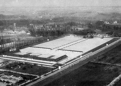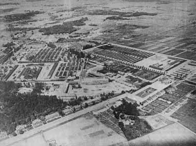 Arial view of Dachau concentration camp This postcard aerial view shows the former Dachau Concentration Camp, which is positioned diagonally across the center of the picture. Notice the line of poplar trees, on the left side of the photo, which delineates the camp boundary on the West side. Just in front of the line of trees, you can see a white building on the left-hand side; this is the Jourhaus, where the gate into the prison enclosure was located. The Dachau concentration camp had a wall around three sides of it and the fourth side had an electrified barbed wire fence and a moat formed by the Würm river canal on the West side. This photo is not oriented towards true North. The original operations building of the camp, which is now the Museum, is the wide U-shaped building with a dark roof that you see at the end of the camp that is closest to the bottom of the picture. Behind this building is another long narrow building, which was the bunker or the camp prison. At the North end of the camp, you can see the Catholic Memorial Chapel, a round building located at the end of the main camp road. The camp road is outlined by a double row of popular trees which look like black dots in this photo. After the camp was liberated, the poplar trees were cut down, but they were replanted when the camp was turned into a Memorial site. To the right of the Catholic Chapel is the Jewish Memorial and to the left of the Catholic Chapel is the Protestant Memorial Chapel. The white buildings outside the wall of the camp, located between the Catholic Memorial Chapel and the Jewish Memorial, are the Carmelite convent. The crematorium building, known as Barrack X, is hidden by the clump of trees outside the far left corner of the camp. The gas chamber is located inside the crematorium. You can see the two reconstructed barracks buildings just beyond the Roll Call Square in front of the operations building. There are four white guard towers in the picture, three on the right side and one in the middle of the wall on the left side. Another guard tower has been converted into an entrance to the Carmelite convent. There were originally 7 guard towers, including Tower A on top of the Jourhaus. The one remaining tower on the left side is Tower B. The aerial photo below was taken in 1945. It is not oriented toward the North. ![]()
