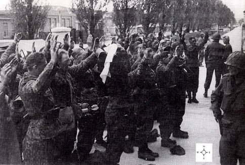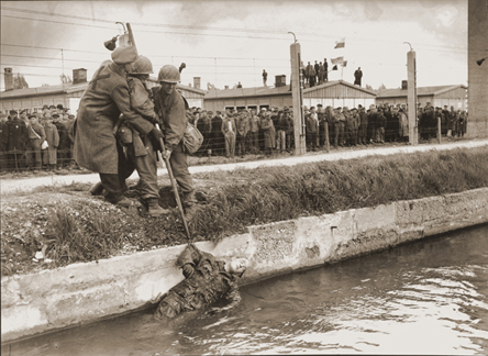 The killing of the guards in Tower B11. After entry into the camp, personnel of the 42nd Division discovered the presence of guards, presumed to be SS men, in a tower to the left of the main gate of the inmate stockade. This tower was attacked by Tec 3 Henry J. Wells 39271327, Headquarters Military Intelligence Service, ETO, covered and aided by a party under Lt. Col. Walter J. Fellenz, 0-23055, 222 Infantry. No fire was delivered against them by the guards in the tower. A number of Germans were taken prisoner; after they were taken, and within a few feet of the tower, from which they were taken, they were shot and killed. Quoted from the IG Report of the U.S. Seventh Army ![]() ![]() The photograph at the top of the page shows the bodies of six SS soldiers at the base of Tower B in the Dachau concentration camp after they were gunned downed by American soldiers. The bodies of two other SS men from Tower B had fallen into the Würm canal beside the tower. The second photograph above shows how the restored guard tower B looks today. When the camp was in operation, the door into the tower was outside the fence. During the reconstruction, the door was put inside the prison enclosure. On April 29, 1945, the day that the Dachau concentration camp was liberated by American troops, white flags had been flying from all seven of the Dachau guard towers since 7 o'clock in the morning. When American soldiers first entered the camp, eight SS men descended from Tower G, the one closest to the gatehouse, and then surrendered with their hands in the air. One of the guards in Tower G was an SS man named Stahl, who survived to tell the story. Eight guards from Tower A, which is on top of the gatehouse, then came down the stairs and surrendered to the Americans. The guards in Tower B also surrendered to the American liberators, but were gunned down. ![]() The photograph above shows Waffen-SS soldiers who had been sent to Dachau to surrender the camp to the Americans. All of the regular guards had escaped from the camp the night before. There were 128 SS men in the camp prison who were released and ordered to guard the camp after the regular guards left. The view in the photo above is looking north. On the right side of the photo is the road that ran alongside the prison compound on the west side. Tower B is located midway down this road, but not shown in the picture. The building in the upper left corner of the photo has since been torn down and there is now a wall in the location where the line of poplar trees is shown in the photo. Another wall and an iron gate now separate this part of the prison camp from the gatehouse, which is behind the camera in this photo. The crematorium building where the gas chamber is located is at the end of the road alongside the prison enclosure, on the west side of the Würm river which is shown in the photo below. The photograph below shows two soldiers from the 42nd Rainbow Division and one of the released prisoners pulling the body of a dead Waffen-SS soldier from the Würm river which flows in a concrete-lined canal along the west side of the camp. The American soldier on the far right is 19-year-old Richard F. Dutro of 232 Infantry, E Company from Zanesville, Ohio. ![]() Dr. Victor Maurer, a Red Cross representative from Switzerland, had arrived at the Dachau prison compound on April 27, 1945, two days before the liberation. Maurer had tried to persuade Obersturmführer Johannes Otto, the Adjutant to the last Commandant, Edward Weiter, to leave guards in the towers in order to secure the camp until the Americans arrived, but most of the regular guards left on April 28th, along with Martin Gottfried Weiss, the acting Commandant. The Commandant of the camp, Eduard Weiter, had already left on April 26th with a transport of prisoners headed toward Austria. Finally, Maurer convinced SS 2nd Lt. Heinrich Wicker not to abandon the camp, but to leave guards posted in the towers to keep order until the prisoners could be turned over to armed American soldiers. Wicker was in charge of a group of SS men who had recently arrived at Dachau; they were former guards in three sub-camps of the Natzweiler-Struthof camp in Alsace. The guards who were gunned down by Wells and the other American soldiers had only been at Dachau for a few weeks and they were, in no way, responsible for the conditions in the camp. Maurer knew that there were around 800 common criminals, including convicted murderers, who had been imprisoned at Dachau. He was fearful that an estimated 40,000 vengeful Dachau inmates would be released to wreak havoc in the surrounding area which was still a battle zone. There was also a typhus epidemic in the camp and Maurer did not want the prisoners to be released until the epidemic could be brought under control. When an advance party from the 42nd Division arrived in a jeep on the street that borders the south side of the SS complex, they saw Maurer and Wicker waiting to surrender the camp under a white flag of truce. At the same time, I Company of the 157th Regiment of the 45th Division was arriving at the railroad gate into the SS camp, on the west side of the complex, almost a mile from the prison enclosure. After Waffen-SS soldiers who had surrendered to I Company were gunned down in the coal yard of the SS camp, Lt. William Walsh led his men toward the prison enclosure east of the SS camp. There they met some of the soldiers of the 42nd Division along the barbed wire fence on the west side of the concentration camp. The shooting of disarmed German soldiers during the Dachau liberation was investigated by the Office of the Inspector General of the Seventh Army. Their report was finished on June 8, 1945 but was marked Secret. The report has since been made public and a copy of it was reproduced in Col. John H. Linden's book entitled "Surrender of the Dachau Concentration Camp 29 April 1945." Here are four paragraphs from the report which pertain to the shooting of the g