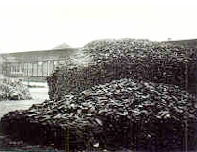 Bodies found inside the crematorium at Dachau The photograph below shows a huge pile of shoes that was found by the American liberators in the Dachau camp. In the background is one of the factory buildings just outside the prison compound. Prisoners worked in sorting shoes brought from the death camps in Poland; there was also a shoe repair shop at Dachau.