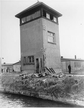 Tower B is shown in the photo below, taken in 1945 after the liberation of Dachau. The bodies of dead German soldiers can be seen at the base of the tower.