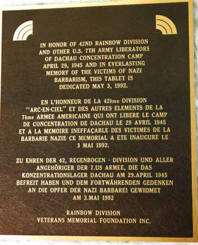 During World War II, the Rainbow Division was activated in July 1943, and following the Normandy Invasion, three Infantry Regiments were sent to Europe in the Autumn of 1944, ahead of the rest of the division which did not arrive in France until January 1945. The three Infantry divisions were designated "Task Force Linden," named after Assistant Division Commander, Brigadier General Henning Linden. The division fought its way across France and Germany until they finally reached Munich on April 30, 1945, a week before the Germans surrendered. Along the way, they stopped to accept the surrender of the Dachau concentration camp, the event that earned lasting fame for the Rainbow Division. A plaque in the Division's honor hangs on one of the outside walls of the Jourhaus at Dachau. This is the building which has the famous "Arbeit Macht Frei" sign on the iron gate.