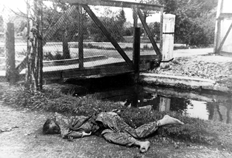 Surrender of the Dachau campPrevious"Up until April 29, 1945, the majority of us in my unit were not aware of the Nazi efforts to exterminate the Jews - certainly not its scope, nor its effect on the world; and certainly none of us were aware of the Dachau Concentration Camp. We had been briefed Stateside on the unjust imprisonment of large numbers of people by the Germans, and their being forced into a kind of slavery. But nothing could have prepared me for what was to unfold in that small dorf north and west of Munich in Bavarian Germany." Lt. Jack E. Westbrook, Anti-Tank Company, 222nd Regiment, 42nd Division of the US Seventh Army. ![]() The photograph above shows Red Cross representative Victor Maurer, wearing civilian clothes, and holding a stick with a white flag on the top of it. Behind him is SS 2nd Lt. Heinrich Wicker who has just formally surrendered the Dachau concentration camp to the 42nd Rainbow Division of the US Seventh Army. The fence in the background surrounds the SS garrison that was right next to the camp. Note the scar on the side of Wicker's face. Before being assigned to duty in the concentration camp system, Wicker had been a Waffen-SS soldier who suffered a bullet wound to the jaw while fighting in combat on the Eastern front. According to Nerin E. Gun, a Turkish prisoner at Dachau who wrote a book called "The Day of the Americans," which was published in 1966, the SS men had decided to defend the camp with machine guns located in the towers. Col. Howard Buechner, a medical officer in the 45th Thunderbird Division, used Gun's account in his book "The Hour of the Avenger." Quoted below, from a book of memoirs entitled Dachau 29 April 45 which was edited by Sam Dann, is the account of Corp. Robert W. Flora, H Company, 222d Regiment, 42nd Rainbow Division: I was in on that battle for Dachau - and this is what I remember: There wasn't very much resistance in the town, itself. But then, we moved along those railroad tracks. This is when we really started to hate the Germans. My machine gun was front-mounted on my jeep. Col. Downard said to me, "You're the man. Go out in front and lead us in. I said to him, "Colonel, I came this far. Do I have to get killed now?" You could say things like that to Downard. Well, we had put up a loudspeaker calling on the SS to surrender, but they wouldn't. And so, Downard said to me, "If we try to blast 'em out with artillery, we'll kill too many innocent people. It's Infantry time." So we moved forward. A German machine-gunner, from a tower, pinned us down for a bit. We got rid of him and moved on through the Main gate - I think it was. As we started in, we were held up again by a machine gun that was firing at us from a window in one of the buildings. He would give us a burst, duck away, and then give us another short one. I just set the sights of my Heavy-Thirty (thirty-caliber, water-cooled machine gun) on that window and waited for him to rise up again. When he did, I got him. Then, I remember that huge mass of prisoners just milling around. We saw terrible things - people lying in heaps - all dead. And, of course, all those corpses in the furnace room. What a horrible sight to see! We captured some of the guards. They were lucky that we took them alive. The ones that we didn't kill or capture were hunted down by the freed inmates and beaten to death. I saw one inmate just stomping on an SS Trooper's face. There wasn't much left of it. S/Sgt. Ralph Miller from Mora, Minnesota, a soldier in the 42nd Division, was also there that day, moving along the railroad tracks towards the Dachau camp. In an e-mail to me, his nephew Peter Miller gave the following account of Ralph Miller's story, as told to him by his father, Ralph's brother: He told me how Ralph and another guy from MN were going through the woods on April 29, 1945. They came across a large encampment surrounded by barbed wire. My dad says that Ralph didn't then know what it was. He ordered the SS guard to surrender in broken German. The guard refused and shot at them. He pleaded and tried to explain that the main American army was coming. Ralph had to shoot the guard and the two went to the gate and shot the lock. Upon entering the encampment, Ralph found out he was in a prison camp (concentration camp). My dad says that he never wanted anyone to know about this as he was embarrassed for his German ancestors. My father was very affected by what my uncle saw and told him. My dad also mentioned that Ralph had pictures and showed them to my dad when they were back on the farm in Mora, Minnesota. Ralph showed them to him, then took them outside and burned them. He didn't want anyone to have to see what he encountered in Dachau. My dad did say that Ralph saw first hand the awful things that the Nazis did to those people. I asked about the woods and my dad corrected me and said that Ralph found the camp by accident. They were looking for ammo dumps and store houses. Dad said that Ralph had orders to shoot anyone that didn't surrender. He knew how to ask, but whoever he asked in Dachau refused. My dad did reiterate that Ralph did shoot guards in a tower that refused to surrender. The following is a description of the surrender of the Dachau camp written by Paul M.G. Levy, a former Professor of the University of Strasbourg and the Catholic University of Leuven. A native of Belgium, Levy was arrested as a Communist political prisoner by the Nazis and imprisoned for a year at Breendock in Belgium before he was released. He was a reporter for the British Broadcasting Company, following the American troops, when he was invited by Brig. General Linden to accompany his party to Dachau as an interpreter. Levy was particularly interested in the liberation of Dachau because one of the prominent prisoners there was Arthur Haulot, a political prisoner, who became a member of the Belgian Parliament after the war. Levy's words are quoted from the book entitled "Dachau 29 April 1945": A white fl