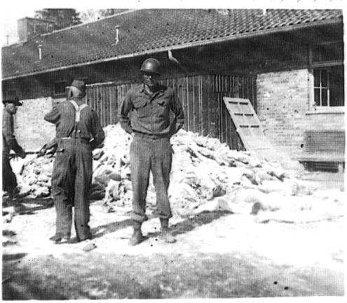 Pile of bodies in front of the Dachau crematorium, May 1945 Photo Credit: Donald E. Jackson, 40th Combat Engineer Regiment On April 30, 1945, the day after the Dachau concentration camp was liberated, the 40th Combat Engineer Regiment, which was supporting the 45th Thunderbird Division, arrived to take over in the aftermath of the liberation. The soldier in the photo above is Eldon Patterson of E Company, 40th Combat Engineers. In the background is a pile of naked dead bodies, stacked up outside the crematorium. Behind the bodies is Baracke X, the crematorium building, with a wooden structure attached to the brick building. This structure, which has long since been removed, was mentioned in the Chavez Report, written by a US Army officer, after the liberation of Dachau. This report, which was subsequently entered into the Nuremberg International Military Tribunal as Documents 159L and 2430-PS, stated that this structure was a "Wooden shed believed to contain a pump or compressor."