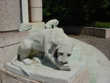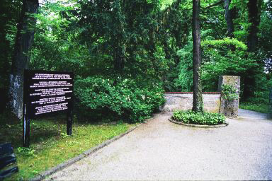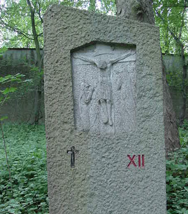 Italian Memorial Chapel![]() The Italian Memorial Chapel at Leitenberg, called Regina Pacis, was designed by Dr. Enea Ronca from Verona. The name means Queen of Peace. The Memorial Chapel was consecrated on July 31, 1973. It is dedicated to the memory of all the Italians who died in the Nazi concentration camps. There were 3,388 Italians counted at the Dachau concentration camp at the last roll call on April 26, 1945, three days before the camp was liberated. A steep path from the parking lot at Leitenberg leads directly to the Italian Memorial Chapel, which is located just outside the low wall of the Leitenberg cemetery. This path up to the Memorial Chapel is marked by 14 stones engraved with the Stations of the Cross by sculptor Vittorio di Colbertaldo from Verona. One of the stones is shown in the photograph below. Notice the low wall of the cemetery in the background. This is the 12th Station of the Cross, almost at the top of the hill. ![]() The photograph below shows a close-up of the sculpture on the left hand side of the Chapel. Behind the Memorial Chapel, one can look out and see farm land below the hill. On the hillside in front of the Chapel is a meadow with tall grass. ![]() If you take the path directly from the parking lot to the Italian Memorial Chapel, don't miss the cemetery, which is down the path to the right as you are standing in front of the Chapel. The black sign on the left in the photograph below has these words written in English: "Dachau-Leitenberg Cemetery - Final resting place of more than 7400 mainly unknown concentration camp prisoners." The sign has the same message written in German, French, Italian and Polish. ![]() This is the end of the tour of historic Dachau. Click on the first link below to begin the tour all over again. To take a photo tour of the Memorial Site at the former Dachau concentration camp, click on the second link below. Backt to Start of tour of Historic DachauBack to List of Historic PlacesBack to Table of ContentsHome |