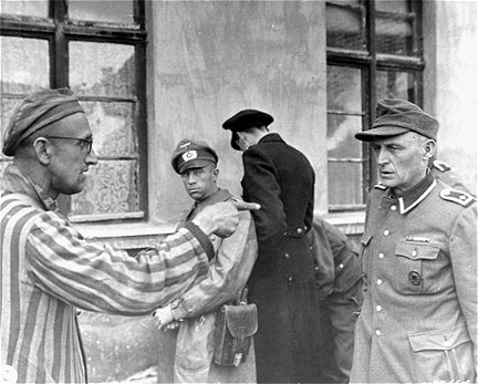 In the photo below, a Russian Prisoner of War points an accusing finger at a German guard whom he claimed had abused him at the Buchenwald camp; this photo was taken on April 14, 1945, three days after the camp was liberated.