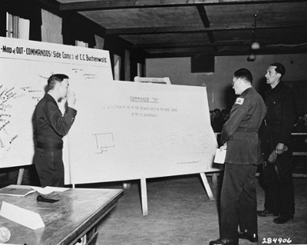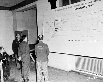 Horst Dittrich, on the far right, testifies about Commando 99 According to Horst Dittrich, an SS man who was a defendant in a subsidiary trial at Dachau, and a witness for the prosecution at the main Buchenwald trial, the Russian Commissars were killed by a shot fired through a slit in the wall of a medical examination room set up in the horse stable at Buchenwald. This horse stable had originally been built for Ilse Koch, who loved to ride horses, to the accompaniment of music played by an SS orchestra. The photograph above shows Horst Dittrich as he points out the location of the room where the Russian Commissars were executed. Dittrich had confessed during his interrogation, so he was a valuable witness for the prosecution.