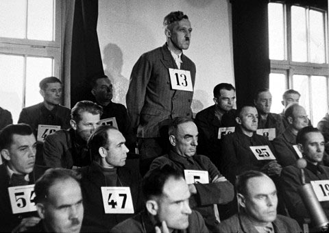 Dachau TrialsUS. vs. Hans Altfuldisch, et alPrevious![]() The "big fish" among the accused in the Mauthausen case was August Eigruber, the former Gauleiter of Upper Austria. He was charged with participating in the common design to violate the Laws and Usages of War because, along with other alleged crimes, he had been involved in helping Heinrich Himmler to acquire the property where the Mauthausen camp was built. Hartheim Castle, near Linz, was also under Eigruber's jurisdiction and he had leased it to the Reich. Prisoners from Mauthausen had been taken to the castle to be gassed, according to confessions obtained by the American military interrogators from several of the accused men. Eigruber was an associate of such top Nazis as Ernst Kaltenbrunner, Adolf Eichmann and Adolf Hitler, all of whom were from Austria. He was also a friend of Martin Bormann, who was Hitler's deputy. When he refused to talk after he was captured, Eigruber was sent to Washington, DC for questioning. Eigruber's importance was such that he was originally slated to be among the men who were tried at the Nuremberg IMT. According to Joshua Greene, who wrote "Justice at Dachau," the chief prosecutor at Dachau, Lt. Col. William Denson, put in a call to Robert Jackson, the chief prosecutor at the Nuremberg IMT and told him, "Send me Eigruber. I'll hang him high as Haman." Haman was the villain in the biblical story on which the Jewish holiday of Purim is based. Denson made good on his boast: Eigruber was hanged on May 28, 1947. On February 18, 1946, August Eigruber was brought from Nuremberg to Dachau and turned over to Lt. Paul Guth for interrogation. Lt. Guth testified on the witness stand that he had not coerced or threatened Eigruber in any way. Although he had previously refused to talk, Eigruber voluntarily signed a statement for Lt. Guth the next day, in which he admitted that he was responsible for leasing Hartheim Castle to the Reich in 1939 for the killing of mental patients who were incurably ill or unable to work. He also admitted to inspecting the Mauthausen gas chamber once and to participating in the execution of ten prisoners of unknown nationality during the night in March or April 1945. Eigruber's statement ended with the following words: This statement was made by me on three pages on the 19th of February 1946, in Dachau, Germany, of my own free will and without compulsion. To save time, a clerk wrote it down on a typewriter. I have read through it, and I have made corrections that appeared necessary to me. The above declaration contains my statements, and I swear before God that it is the entire truth. Signed, August Eigruber. The attorney for the defense, Major Ernst Oeding, objected to the admission of Eigruber's statement into evidence because it had not been witnessed, but his motion was denied by A.H. Rosenfeld, a Jew who was serving as the "law member" on the panel of 8 judges. Normally, a confession must be witnessed to be admissible in a trial, but according to an Allied directive dated 25 August 1945, a military tribunal was not bound by general rules of evidence. The photograph below shows August Eigruber on the far right in the front row, wearing a hat. This photo was taken just outside the Mauthausen camp, near the quarry. The man who is strutting on the far left is Reichsführer-SS Heinrich Himmler, leader of the SS and head of all the concentration camps. Next to him, in the front row, is Franz Ziereis, the Commandant of Mauthausen. Ziereis was never brought to justice; he left the camp on the night of May 2, 1945, but was captured on May 23, 1945 and then "shot while attempting to escape." ![]() Lt. Col. William Denson became famous for his 100% conviction rate in the first four proceedings conducted by the American Military Tribunal at Dachau. He died in 1998 at the age of 85 and in his obituary, he was quoted as saying that August Eigruber was "one of the most arrogant defendants I have ever encountered." Eigruber was allegedly tortured to force him to confess, and there is even a rumor that he was "mutilated and castrated" after he was captured, but apparently even that didn't humble him. In the photo below, Denson seems to be amused by Eigruber's testimony on the witness stand. Note that Eigruber is wearing an Austrian style gray jacket with green trim, rather than the pinstriped suit that he wore on the first day of the trial when he was photographed as he stood up to answer the charge against him. ![]() August Eigruber was the Gauleiter of Upper Austria and according to Marie Vassiltchikov, a nurse who wrote a book entitled "Berlin Diaries 1940 - 1945," Eigruber was the "virtual king of this part of Austria." She wrote that, in the last days of the war, "Gauleiter Eigruber has been thundering over the radio that Oberdonau - the Nazi name for the province of Upper Austria - must stand to the last man; there is no escape now; women and children will not be evacuated, however tough things get, for there is nowhere for them to go. In his rhetoric he copies Adolf; but at least he is frank and does not try to hide the gravity of the situation. By way of compensation, he promised the population a special distribution of rice and sugar." Sadly, the rice and sugar that was promised by Eigruber to the "starving population" was destroyed when several Red Cross trains on a siding at Attnang-Puchheim were bombed by the Allies, killing "all those pretty sunburnt young nurses," according to Vassiltchikov's book. She wrote that Eigruber "is a particularly obnoxious individual, who continues to make fiery speeches about 'resistance', 'honor', etc." Eigruber was a dedicated Nazi, loyal to the end; he died with the words "Heil Hitler" on his lips. In the photo below, Lt. Col. Denson listens as an Army translator asks Eigruber a question in German. The proceedings were painfully slow since the testimony of the accused had to be translated into English for the prosecution team. ![]() The Defense C