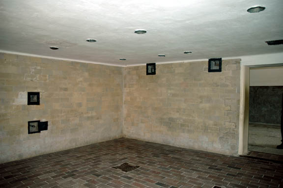 Gas Chambers at Dachau"Baracke X, erected May 1942 to April 1943. It was to serve both as a killing facility and to remove the dead, but the gas chamber in the middle of the building was not used for mass murder. Survivors have testified that the SS did, however, murder individual prisoners and small groups here using poison gas." Words on a sign at the south end of the building, May 2003 ![]()