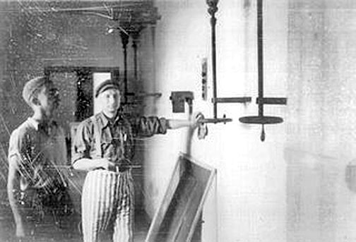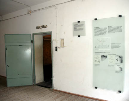 Undressing Room for Dachau gas chamber "Gas chamber - This was the center of the potential mass murder. The room was disguised as 'showers' and equipped with fake shower spouts to mislead the victims and prevent them from refusing to enter the room. During a period of 15 to 20 minutes up to 150 people at a time could be suffocated to death through prussic acid poison gas (Zyklon B)." Quoted from a display on the wall in the undressing room next to the gas chamber at Dachau. ![]() The photograph above shows the wall of the undressing room next to the Dachau homicidal gas chamber where there is a display which explains the gassing operation. On the left is the door into the gas chamber; the word painted over the door is "Brausebad" which means "shower bath." ![]() According to the information on this wall, the victims were first brought to the waiting room which is the first room at the south end of the crematorium building. The text of the display on the wall, shown in the photo above, reads: "Waiting room - This is where victims were to be informed on using the supposed 'showers.'" When I visited Dachau in May 2001, there was a display in the waiting room which showed a copy of a letter from Dr. Sigmund Rascher to Heinrich Himmler, which mentioned that a gas chamber was planned for Dachau, and also a copy of the blueprints of the building which identified the gas chamber as a shower room. When I visited again in May 2003, these displays had been moved to the Museum and the waiting room was empty. The text of the display on the undressing room wall describes the undressing room as follows: "Disrobing - This is were (sic) the victims were to leave their clothes before entering the gas chamber disguised as 'showers.' Their clothing was to be brought to the disinfecting chambers before the next group could enter the room." The prisoners' clothing was disinfected with Zyklon-B, the same gas used to murder the victims in the gas chamber. Four disinfection chambers are in the same building where the homicidal gas chamber is located. The disinfection of the clothing was done to kill the body lice which spreads typhus. The west wall of the undressing room has a door into the corridor that runs behind all the rooms in the crematorium building, including the gas chamber. This door, shown in the photograph below, is locked and visitors are not allowed into the corridor. The photograph below also shows the electrical wiring on the north wall of the undressing room, which is next to the gas chamber. Below the wiring is a large pipe which comes through the wall from the corridor and enters the gas chamber. The other side of this pipe cannot be seen inside the gas chamber because it enters the room above the 7.6 foot ceiling of the gas chamber. The ceiling of the undressing room is about 10 feet high. ![]() Although visitors are not allowed into the corridor behind the gas chamber, the display on the undressing room wall has both a photograph and a drawing of the pipes in the corridor. The title of this section is "Operating facilities in the adjacent left corridor." The drawing in the display was done in May 1945 by Captain Fribourg, a member of the French Military Mission with the Sixth Army Group, Chemical Warfare. Captain Fribourg did an examination of the gas chamber at Dachau for one day and then wrote a report in which he did not reach any definite conclusion. He was of the opinion that a second visit would be necessary in order to study the system for circulating the gas and he also recommended that the walls be tested, but this was apparently never done. France and the Soviet Union were in charge of prosecuting the German war criminals on the charge of Crimes Against Humanity at the Nuremberg IMT, but no report on the walls of the Dachau gas chamber was entered into the proceedings. The pipes and valves behind the west wall of the gas chamber can be seen in the movie that is shown at the Dachau museum. This movie has footage from the film that was shown at the Nuremberg International Military Tribunal as proof that a gas chamber was used to murder prisoners at Dachau. The narration in the film explains the gassing procedure as follows: "Inside the showerbath -- the gas vents. On the ceiling -- the dummy shower heads. In the engineer's room -- the intake and outlet pipes. Push buttons to control inflow and outtake of gas. A hand-valve to regulate pressure. Cyanide powder was used to generate the lethal smoke." The "push buttons" referred to in the film are shown in the drawing done by Captain Fribourg, but they are gone now. According to the information on the undressing room wall, they were stolen during the postwar years. ![]() The photo above shows the push buttons before they were stolen. There were 4 push buttons and 4 sets of light fixture boxes in the gas chamber when the American liberators arrived. However, four of the light fixture boxes now have no lights and according to the film shown at Nuremberg, four of the light fixture boxes were used as "gas vents" to put lethal gas into a fake shower room. Interior of Gas Chamber, continuedExterior of Gas ChamberDisinfection Gas ChambersBack to Table of ContentsHomeThis page was last updated on June 13, 2009 |