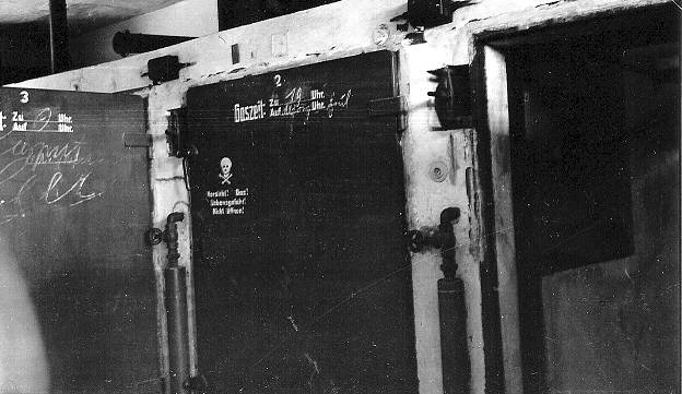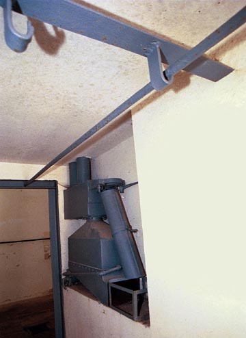 Gas input device in disinfection chambers![]() ![]() The photo above shows what the disinfection chamber doors looked like when the American soldiers first arrived at Dachau. The doors were repainted after the camp was turned into a Memorial Site so as not to confuse people, as the doors originally had the word "Gaszeit" written on them. The American liberators assumed that these rooms were used for homicidal gassing. ![]() The photograph above shows the interior of one of the disinfection gas chambers with the gas input device in a niche on the wall. The doors to each of the 4 chambers could be opened to the outside on both ends to air them out after gassing. Notice that all the pipes and electrical boxes are located on the outside of the disinfection gas chambers to prevent a possible explosion. The photograph below is a close-up of the gas input device. ![]() The gas input device, manufactured by the DEGESCH company, was designed to automatically open a can of Zyklon-B pellets and dump them into a wire mesh basket. Hot air was then blown into the room to raise the temperature to 78.3 degrees Fahrenheit so that the poison gas would be released quickly and distributed throughout the room. Zyklon-B was the trade name for hydrocyanic acid (HCN) which was sold by DEGESCH. After gassing, the pellets were recovered from the wire-mesh box, put back into the can and returned to the manufacturer to be recycled. Unlike the homicidal gas chamber at Dachau, there are no lights or electrical wiring in the disinfection chambers, and no drains on the floor. There are no exhaust vents in the ceiling because the rooms were aired out by opening the wide doors. The photo below shows one of the two bars on the ceiling which was used to hang the clothing on hangers while it was being fumigated. ![]() The walls of the fumigation cubicles have been covered with pure white paint and do not show any blue staining. If these rooms were used regularly for delousing with Zyklon-B, the walls would have been heavily stained with blue color, called Prussian Blue, which is a characteristic of Zyklon-B use. In May 2001, the white paint on the walls looked mottled, as though the blue stains underneath were beginning to show. The walls of the homicidal gas chamber at Dachau have not been painted over and there are no blue stains, as in the Majdanek gas chamber, shown in the photo below. ![]() PreviousOld Disinfection BuildingBack to Table of ContentsHomeThis page was last updated on March 13, 2008 |