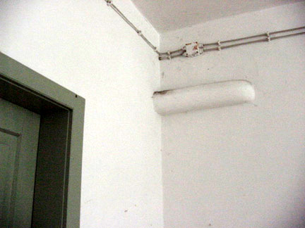 Congressional visit to gas chamber, 3 May 1945PreviousThe U.S. Army's Chavez report stated that there were "double glassed lights, sealed and gas proof" in the gas chamber, which was a reference to four of the recessed boxes near the ceiling that contain light fixtures. The Chavez Report also stated that the gas was mixed in the basement and rose through the "top vents" which was a reference to four of the recessed boxes that do not contain a light fixture. The photo below shows a close-up of the light fixture box in the northeast corner of the gas chamber. Note the wiring for a light fixture that has been removed. This box was described as a "gas vent" in the film, made on May 3, 1945, which was shown at the Nuremberg IMT on November 29, 1945. This film can be viewed on the web site of the US Holocaust Memorial Museum. ![]() The photo below shows the electrical wiring near the ceiling of the undressing room; just below the wiring is a pipe which enters the south wall of the gas chamber where there are two "top vents" like the one shown in the photo above. If the gas was mixed in the room below and rose through these top vents, as stated in the Chavez Report, the pipe shown in the photo below might have been the means of bringing the gas to the vents. However, there is no similar pipe that enters the north wall of the gas chamber where two more "top vents" are located. ![]() ![]() The photograph above shows the door on the north side of the gas chamber which opens into the morgue room. This same door is shown in the background of the photo below which is a still photo from the movie made on May 3, 1945. ![]() PreviousInterior of Gas ChamberExterior of Gas ChamberDisinfection Gas ChambersBack to Table of ContentsHomeThis page was last updated on December 9, 2006 |