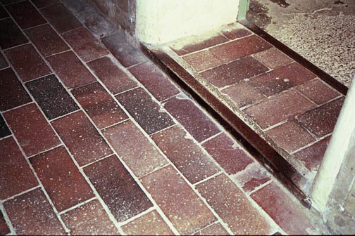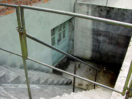 Dachau gas chamber"The gas chamber, about 20 feet by 20 feet, bears all the characteristics of an ordinary communal shower room with about fifty shower sprays in the roof, cement ceiling and cement floor. But there is not the usual ventilation, and the sprays squirted poison gas. One noticed that the doors, as well as the small window, were rubber-lined and that there was a conveniently situated glass-covered peephole to enable the controller to see when the gas could be turned off. From the lethal chamber a door leads to the crematorium. We inspected the elaborate controls and gas pipes leading into the chamber." From a Report on Dachau Concentration Camp, signed by C.S. Coetzee and R. J. Montgomery who visited the camp on or about 7 May 1945. ![]() The photograph above shows the "elaborate controls and gas pipes leading into the chamber" as mentioned in the American Army report quoted above. They are located in a narrow hallway behind the west wall of the gas chamber. The hallway is off limits to tourists; this photo was taken through the window outside. The floor of the Dachau gas chamber is made of glazed brick, not concrete, as the photograph below shows. This is the doorway leading from the gas chamber into the mortuary room. At the top right-hand corner of the photograph, one can see the concrete floor of the mortuary. There is no door leading directly to the crematorium, as the report quoted above describes. The mortuary room is between the gas chamber and the crematorium. There is no window in the gas chamber, as the quoted document describes, although there is a window in the mortuary room. ![]() "The new building had a gas chamber for executions... the gas chamber was labeled 'shower room' over the entrance and was a large room with airtight doors and double glassed lights, sealed and gas proof. The ceiling was studded with dummy shower heads. A small observation peephole, double glassed and hermetically sealed was used to observe the conditions of the victims. There were grates in the floor. Hydrogen cyanide was mixed in the room below, and rose into the gas chamber and out the top vents." Report of the Atrocities Committed at Dachau Concentration Camp, signed by Col. David Chavez, Jr., JAGD, 7 May 1945 The photograph below shows one of the "grates in the floor" that was mentioned in the official US Army report signed by Col. Chavez, which is quoted above. There are 6 of these grates, which appear to be floor drains. The "fifty shower sprays" described in the first report, quoted at the top of the page, are actually 15 "dummy shower heads," as described in the Chavez report, but neither water nor gas could have come through them, as the fake showerheads were not connected to any pipes. The photograph below shows a close-up of one of the 6 floor grates in the gas chamber. The grates are in 2 rows of three in the center of the room. The floor slopes towards the center, so that water would drain into the grates. The size of the drains is approximately 20 by 26 inches. Note that the drains have been closed up. ![]() ![]() The photograph above shows the stairs to "the room below" as described in the Chavez report. These stairs are located behind the gas chamber building on the west side. According to the description of the gas chamber in the Chavez report, the gas entered the room from the basement through the "top vents," one of which is shown in the photo below. ![]() PreviousExterior of Gas ChamberDisinfection Gas ChambersBack to Table of ContentsHomeThis page was last updated on March 13, 2008 |