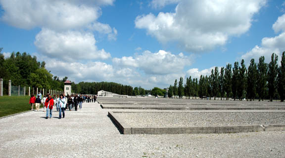 The story of Dachau, as told to touristsEntrance to the Dachau Memorial Site![]() In 2005, the entrance into the Dachau Memorial site was changed so that visitors can now see a section of the brick path on which the prisoners walked as they neared the Arbeit Macht Frei gate into the prison camp. The photo above shows the brick path and the grass covering the rubble of the factory buildings that were torn down after American troops took over the SS training camp and garrison next door to the concentration camp. A new gravel path, which leads from the bus stop to the Arbeit Macht Frei gate, was constructed in 2005 on the south side of the Dachau complex, which includes the former concentration camp and what is left of the former SS Army Garrison and Training Center for concentration camp administrators, which the Dachau tour guides refer to as a "school of violence" or a "school of terror." The entrance into the Dachau Memorial Site was changed again when a new Visitor's Center was completed. New signs which tell the story of Dachau were added. Visitors can now see a few of the buildings inside the former SS garrison, including the Administration building which is the white building trimmed in yellow on the right in the photo below. When I visited in 2007, I was told that this building was the Commandant's house, but I have since learned that the house was torn down in 1987. ![]() The brick path, shown in the photo above, was originally lined on both sides by a row of poplar trees. On the left side of the road, as you are looking into the SS training camp, there were formerly factories where the prisoners worked, and on the right side was an open field with a view of the barracks inside the concentration camp. Most visitors assume that the tracks on the left side of the photo above were railroad tracks on which trains loaded with prisoners arrived at the camp. These tracks were actually narrow gauge tracks used to transport material to and from the factories; the prisoners had to walk 3 kilometers to the camp from the railroad station in the town of Dachau. There are now 12 posters along the route from the station to the camp which tell visitors what happened as the prisoners walked through the town. Dachau was not turned into a Memorial Site until 1965. A visitor who saw the former Dachau concentrtion camp in 1964 wrote this on his blog: One evening I asked what I shouldn't miss when in Munich. More than one fellow traveler told me to make sure I visited Dachau, which was not far to the north. The next morning I made my way to the Autobahn and hitchhiked north towards the infamous destination. Drivers who picked me up would ask where I was going. When I replied "Dachau", the response was uniform; the conversation quieted to silence. In retrospect, the response shifted from awkward embarrassment to naked shame. I had to walk the last 2 or 3 kilometers to the entrance, as it was far away from any settlement. There was no commerce or residence in the area. The day was very gray, and it was as if the whole countryside was sterile. As I approached, there was a very long border of high wire fence. Walking through the entrance I found no one in attendance. I moved in turn through all the buildings and the displays. I never found a soul the entire day, at least none that were living. The dead were extremely prominent. I recollect photos of bones covered by skin, of "scientific" experimentation by hypothermia, of long, unheated wooden buildings (still standing at the time) where the inmates slept and became infected with lice and typhus.