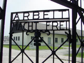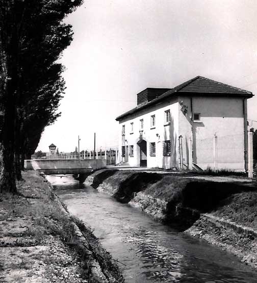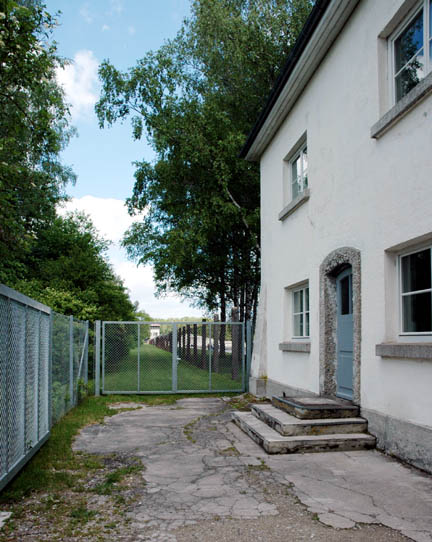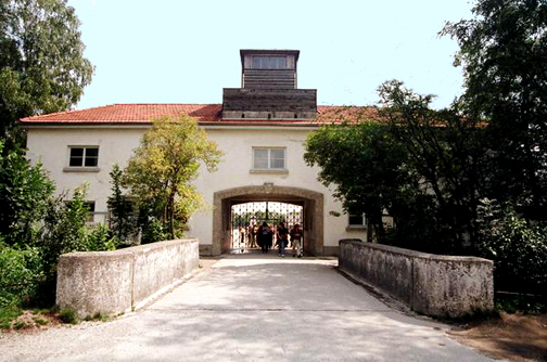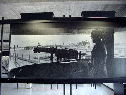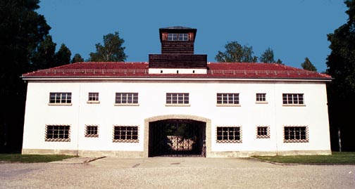 Gatehouse into Dachau prison compound![]() The photograph above shows a view of the Dachau prison compound gatehouse, looking north toward the location of the old crematorium which was outside the camp. This was the direction from which soldiers of the 45th Thunderbird Division of the US Seventh Army approached the Dachau concentration camp gatehouse on April 29, 1945, according to William Donahue of the 42nd Rainbow Division, as quoted by Flint Whitlock in "The Rock of Anzio": Pretty soon, the 45th came along from the north, along the moat. Some of them had been drinking. The general took a bottle from one of them and threw it in the moat. The prisoners were starting to rush the gate so the general sent me upstairs, where some of the prisoners were climbing over their own bodies to get up to the windows and were trying to come in. The iron gate shown in the background in the photo above was not there when the camp was in operation. This fence was erected in 2005 when the entrance to the Memorial Site was changed. The SS Army Garrison was separated from the Dachau concentration camp by the Würm river canal, which is shown in the old photo below. The gatehouse is on the right, and Tower B can be seen in the background. Note the line of poplar trees on the left which have since been replaced by other trees, as shown in the second photo below. ![]() The photo below shows the bridge over the Würm river canal which separated the prison compound from the SS Army Garrison at Dachau. ![]() On liberation day, April 29, 1945, some of the prisoners climbed up to the second story windows of the gatehouse and a few then climbed out the ground floor windows on the outside of the camp to freedom. The photo below shows Brig. Gen. Henning Linden standing on top of one of the barriers of the stone bridge, while the liberated prisoners are looking out of the windows of the gate house. ![]() Brig. Gen. Linden, the man standing on top of the bridge, was the commander of the 42nd Rainbow Division which accepted the surrender of the prison compound from 2nd Lt. Heinrich Wicker, the tall German soldier shown on the far left in the photo above. The man with a white arm band is Red Cross representative Victor Maurer who assisted in the surrender of the camp. The Dachau gate was designed to open from top to bottom to allow vehicles or a group of prisoners to enter. It was secured by a bar, which had to be removed to open the gate. It also had a pedestrian gate with a lock that could only be released by remote control from inside the building. ![]() The photograph above was taken by Lt. William J. Cowling III on the day that Dachau was liberated, April 29, 1945. This view is looking east towards the inside of the camp where the prisoners are attempting to get out while American soldiers are standing outside the gatehouse trying to keep them inside. This YouTube Video shows that the Dachau gate opened just like the gate into the Sachsenhausen camp which is shown in the 1999 photo below. The second photo below shows the pedestrian gate at Dachau which was reconstucted with a replica of the sign that was stolen when the camp was liberated. The gate at Dachau opens just like the Sachsenhausen gate, but with the Arbeit Macht Sign on the right half of the gate, instead on the left. ![]() ![]() In the background of the photo above, one can see the West Wing of the administration building, now the Dachau Museum, where the incoming prisoners took a shower and exchanged their clothes for a striped prison uniform before being assigned to a barrack in the concentration camp. The photograph below shows a view of the gatehouse building from inside the camp. The official name for this building is Dienstgebäude, which means duty house, but it was always called the Jourhaus. The building was completed in June 1936. It replaced a wooden building that was used before the Dachau prison compound was completely rebuilt. The Buchenwald camp near Weimar and the Sachsenhausen camp near Berlin both have a gatehouse modeled after this one. ![]() The guard tower at the top of the gatehouse building was called Tower A. Entrance to the tower was through the building. A machine gun, behind a sliding glass window, was trained on the prisoners in the camp, ready to fire in case of a prison riot or disturbance. The photograph below shows a museum exhibit which was in the Dachau Museum when I visited the Memorial Site in 2001. The museum exhibit has since been changed and this photo is no longer shown. ![]() Note that the buildings in the background of the photo above are the old factory buildings which were turned into barracks for an SS Army Garrison at Dachau in 1936. Workers can be seen at work on the construction of the new barracks for the concentration camp prisoners in an area where some of the old factory buildings were torn down. The final layout of the former Dachau prison camp was not completed until 1938 when the present museum building was finished. ContinuePreviousBack to Dachau Concentration CampBack to Table of ContentsBack to Dachau indexHomeThis page was last updated on March 17, 2008 |