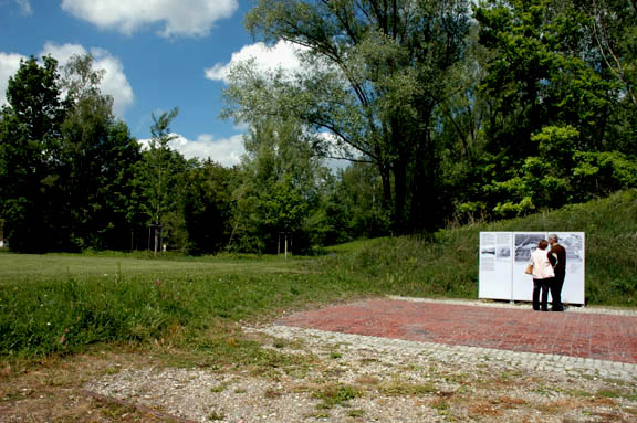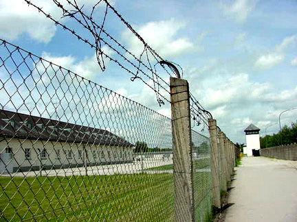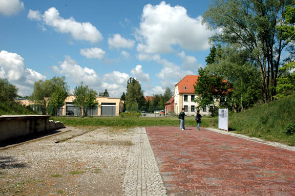 Entrance road into Dachau prison compound![]() The photo above, taken in May 2007, shows the view looking west toward the former SS Army Garrison and Training Camp at Dachau. In the foreground is the red brick road on which the Dachau prisoners walked, between the factory buildings, to the gatehouse into the Dachau prison compound. The gatehouse is behind the camera in the photo above. On the left is a loading ramp and a section of the narrow gauge railroad tracks that led up to the Dachau concentration camp gatehouse. The garage buildings in the background on the left were built after the US Army left the former SS garrison in 1973. The two-story building with a red roof, shown on the right in the photo above, is the Commandant's house. Note the grass in the photo above, which is about two feet higher than the brick road which ends abruptly. The sign on the right tells visitors that the rubble from the former factory buildings, which were torn down in the 1980ies, was covered over with grass. The building in the foreground of the photo below is the former Commandant's house. ![]() ![]() ![]() The photo above shows a section of the brick road leading to the Dachau concentration camp gatehouse that was formerly covered with rubble after the factory buildings were torn down. Note the grass-covered mound of dirt on the left of the photo. Included among the buildings that were torn down was the Präzifix screw factory where Dachau prisoners worked along side civilians who lived in the town of Dachau. There were also factories, which made porcelain figurines, rifles and German army uniforms, where German civilians also worked. After the war, the citizens of the town of Dachau claimed that they didn't know about the gassing, beatings and torture in the Dachau camp, even though they were rubbing elbows with the prisoners on a daily basis. Beginning in 1936, when the Dachau gatehouse was completed, the prisoners marched each day through this gate to the factories, as an orchestra played classical music for them. Dachau was a concentration camp where most of the prisoners worked, not an extermination camp where Jews were brought to be killed. ![]() The photo above shows a model of the Dachau concentration camp and the SS Army Garrison right next to it, as it looked when it was completed in 1938. The prison compound is the rectangular area on the far right. The SS Army Garrison and Training Camp are in the large area on the left. The SS area was separated from the concentration camp by the Würm river canal which ran north and south just in front of the concentration camp gatehouse. The brick entrance road formerly extended west until it intersected the road into the Dachau complex near the main gatehouse, which was located on the south side of the Dachau complex, a short distance west of the Würm river canal. The Arbeit Macht Frei gatehouse entrance into the prison compound is inside the Dachau complex and a short distance to the east of the main entrance. The main entrance building, shown in the photo below, has since been torn down. ![]() Prisoners were usually brought to the Dachau concentration camp from the railroad station in the Lower Town of Dachau, which was west of the Dachau complex. Most of them had to walk to the camp along Friedenstrasse (Peace Street) which paralleled the railroad spur line that ran from the train station into the SS camp through the railroad gate on the southwest side of the complex. A few of the prisoners were brought to the camp on trains which entered the railroad gate. When the prisoners reached the SS Army Garrison on foot, they could then go through a gate on the southwest side of the SS complex, which is shown in the photo below. From this gate, it was about a mile eastward, through the SS garrison, to the "Arbeit Macht Frei" gatehouse shown in the color photo above. The photograph below shows the gate into the SS Army Garrison on the southwest side of the Dachau complex. This gate has since been torn down. ![]() When the former Dachau concentration camp was turned into a Memorial Site in 1965, the US Army was still occupying the former SS Army Garrison, so a new entrance for tourists was made through an opening in the fence on the east side of the camp, which is shown in the photo below. At that time, there was a high wall which separated the "Arbeit Macht Frei" gatehouse building from the US Army garrison. The building on the left in the photo below is the east wing of the administration building which was converted into a Museum in 1965. ![]() ContinuePreviousBack to Dachau Concentration CampBack to Table of ContentsBack to Dachau indexHomeThis page was last updated on March 17, 2008 |