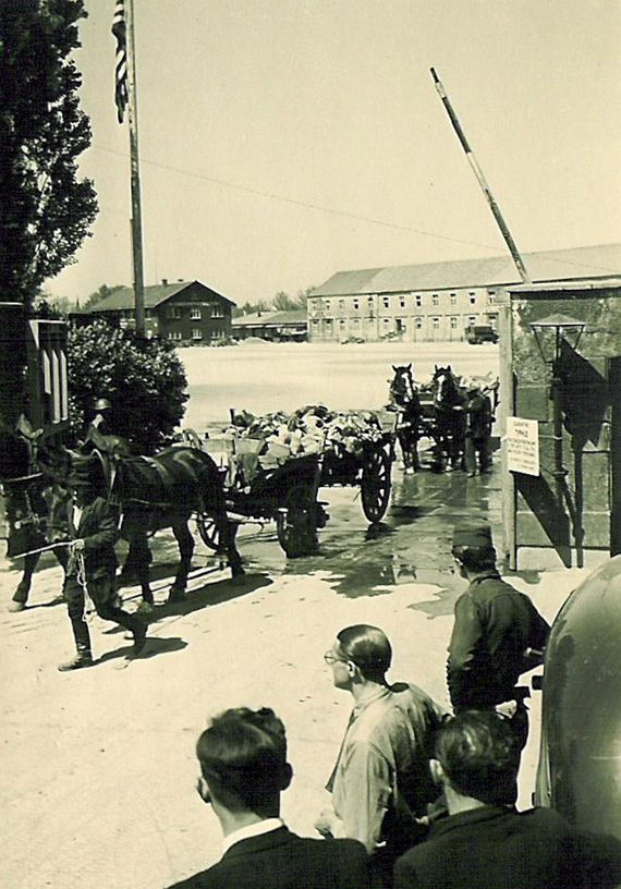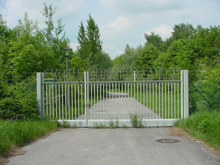 Gate into former Dachau SS Army Garrison![]() The two Dachau city buses which take tourists to and from the Dachau train station to the Memorial Site pass the gate shown in the photo above, which is on the south side of the Dachau complex. This gate is on Pater-Roth-Strasse, a short distance from the new entrance for tourists that was opened in 2005. The photo below, taken in May 1945, shows this same entrance shortly after Dachau was liberated by American soldiers. The gate, shown in the photo below, is on the south side of the Dachau complex, a short distance west of the present tourist entrance. The photo above shows a gate for vehicles into the SS Army Garrison on the south side of the Dachau complex. This gate is located approximately in the center of the combined SS camp and the Dachau concentration camp, as shown on the model in the photo below. Note the large building in the background which is also shown on the model below. ![]() In the photo above, note the small building on the left in the background, which is also shown on the model of the Dachau complex. This photo was taken around May 13, 1945 when burial of the bodies found in the camp began. The main gate building into the Dachau complex was apparently more for show than for practical purposes. PreviousBack to Dachau Concentration CampBack to Table of ContentsBack to Dachau indexHomeThis page was created on May 30, 2007 |