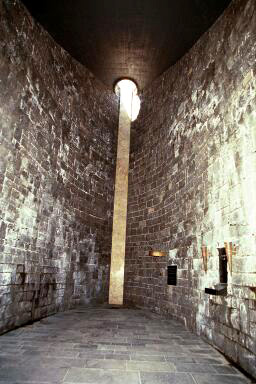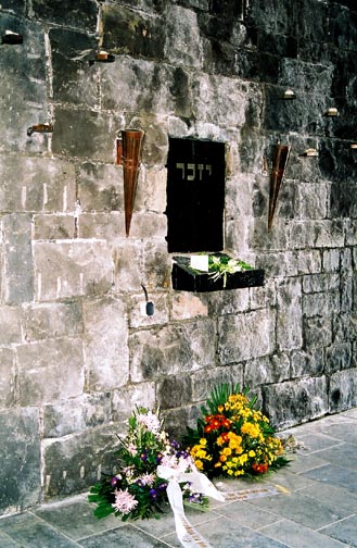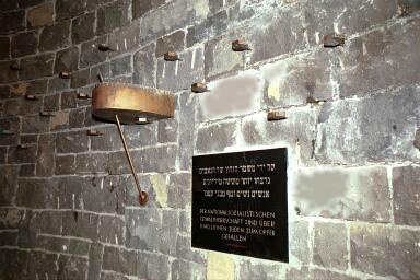 Interior of the Jewish Memorial![]() Both the Catholic Church of the Mortal Agony of Christ and the Protestant Church of Reconciliation at the Dachau Memorial Site are functioning places of worship where the Mass is celebrated and Communion is given in regular church services. However, the Jewish Memorial is not a synagogue or temple where religious services are held. It is a place of remembrance and prayer in honor of the Jews who died at Dachau. The interior of the Jewish Memorial is six feet below ground, the depth of a grave. After descending into this tomb-like room, one can look up through an opening in the roof at the far end and see the Menorah on the top of the building. According to the architect, this symbolizes liberation and hope. The photograph above shows the interior which is about 27 feet high at the end where the hole opens to the sky. The gold-colored shaft on the back wall is made from marble taken from Peki'in in Israel, where it is said that at least one Jew has lived since Biblical times. The photograph below shows the interior wall of the Memorial on the right hand side with a plaque whose inscription in Hebrew reads "Monument of warning to commemorate the Jewish martyrs who died in the years of the National Socialist rule of terror 1933 - 1945. Their death is a warning and obligation for us. Erected by the Regional Association of Israelite Cultural Communities in Bavaria in the year 1966/67." The small objects embedded in wall are candle holders. There are 70 of them, representing the 70 elders of Moses. ![]() On my first visit to the Dachau Memorial Site in May 1997, there were candles, wreaths and flowers everywhere, including many that were left at the Jewish Memorial, as shown in the photograph below. On my second visit in May 2001, there was not a candle or flower in sight, not at any of the religious memorials, nor at the crematoria. On my 2001 visit, the Memorial Site was crowded with school groups, one arriving every 15 minutes, but they weren't bringing any candles or flowers to honor the victims at Dachau. The black marble symbolic lectern on the wall in the photograph below has the word "Yiskor" in Hebrew, which means Remember. ![]() The International MonumentBack to Memorial SiteBack to Table of ContentsHome |