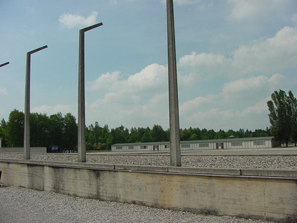 Low wall in front of museum with reconstructed barrack