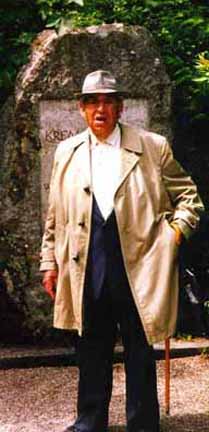 in front of a Jewish Memorial stone at the entrance to the Crematoria