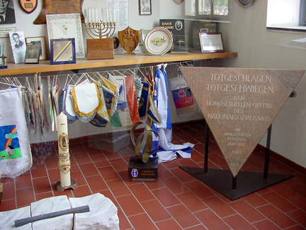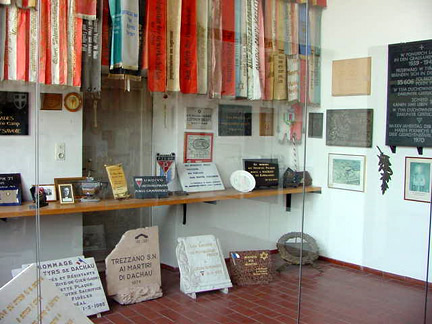 The Dachau Museum in 1965Previous![]() The photograph above, taken in the Dachau Museum in May 2001, shows a scene that was created in 1958 for an East German DEFA film. (Source: H. Obenaus, "Das Foto vom Baumhängen: Ein Bild geht um die Welt," in Stiftung Topographie des Terrors Berlin (ed.), Gedenkstätten-Rundbrief no. 68, Berlin, October 1995, pp. 3-8) This photo is not included in the new Dachau Museum which opened in 2003. The photo below was scanned from the English language version of the Museum Guidebook for the 1965 museum. The caption under the photo says "The youngest of the French prisoners." In the background of the photo is a barrack building of the type used at Auschwitz II, also known as Birkenau. The Dachau concentration camp did not have barracks of this type, which clearly indicates that the photo was not taken at Dachau. Note also that the prison uniform does not have a badge, like those worn on the uniforms at Dachau. A prisoner in the background is wearing a yellow star on his uniform, like those worn by the Jews at Birkenau. ![]() In the Dachau Museum, there is a large theater where a documentary film about Dachau is shown every hour. Beyond the door to the movie theater, there is a hallway; in 1965, this hallway was lined with photographs of the prisoners, taken after they had been liberated. The photo below is one of those that hung in the hallway. The prisoners in the photo are holding a sign which says that they lived in Barrack 27 in Room 4. Note that they are wearing caps which indicate that they were Communist political prisoners. ![]() The hallway led to the commemorative room that you see in the two photographs below. These photographs show the glass cases on each side of the small room. These displays are now in a much larger space in the east wing of the service building. ![]() Notice the pick triangle on the right in the photograph below. At the bottom of the plaque, the words read "To the homosexual victims of National Socialism, the homosexual initiatives of Munich, 1985." The inscription at the top reads "Beaten to death, killed again by silence." ![]() The inscription on the triangle refers to the fact that homosexuals in all the Nazi concentration camps received very harsh treatment from their fellow prisoners, and after the war, the homosexuals were not included in the commemoration of the victims. The pink triangle at Dachau was first placed there on June 18, 1995. In the early days of the Dachau camp, the "Kapos," who supervised the other prisoners, were German criminals who typically treated the homosexuals very badly. Later the internal administration of the Dachau camp was taken over by the Communist inmates. After the war, it was the Communists who designed and supervised the Dachau Memorial Site. There is no pink triangle on the bas relief sculpture at the International Monument, and also no green triangle in honor of the German criminals. The new 2003 Dachau museum mentions both the homosexuals and the German criminals as victims of the Nazis. Photos in Museum at Dachau in 1965PreviousHomeThis page was last updated on March 15, 2008 |
