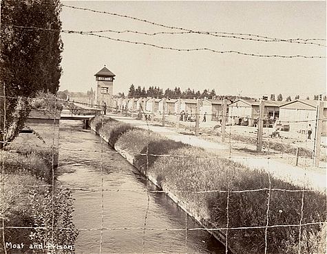 The photo below shows the Dachau concentration camp in 1945 after it was turned into War Crimes Enclosure No. 1. Note that the camp was divided into sections enclosed by barbed wire. This is the west side of the camp with Tower B in the background.