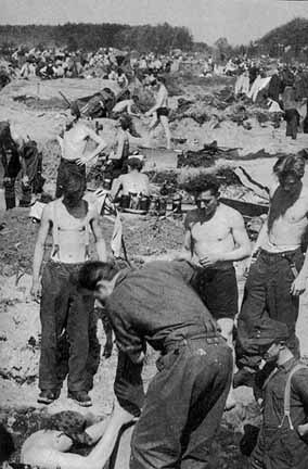 HOESS: The catastrophic situation at the end of the war was due to the fact that, as a result of the destruction of the railway network and of the continuous bombing of the industrial plants, care for these masses--I am thinking of Auschwitz with its 140,000 internees--could no longer be assured. Improvised measures, truck columns, and everything else tried by the commanders to improve the situation were of little or no avail; it was no longer possible. The number of the sick became immense. There were next to no medical supplies; epidemics raged everywhere. Internees who were capable of work were used over and over again. By order of the Reichsführer, even half-sick people had to be used wherever possible in industry. As a result every bit of space in the concentration camps which could possibly be used for lodging was overcrowded with sick and dying prisoners.While Gert Naumann was a prisoner in the Dachau War Crimes Enclosure, he had a wound in his thigh, according to his diary. He wrote that the wound was "festering and does not heal." He went to the camp sick bay, "But there is no more ointment, no more bandages." Naumann claimed to also have fever and pain in the area of the liver, but there was no hospital in the camp, according to his dairy.