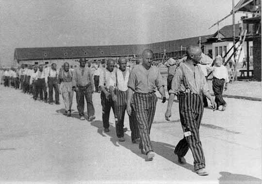 In the six years before World War II started in 1939, the prisoners in the Nazi concentration camp at Dachau were well fed, and those who worked were given the traditional German second breakfast (Brotzeit). The photo below shows healthy prisoners marching to the music of the camp orchestra.