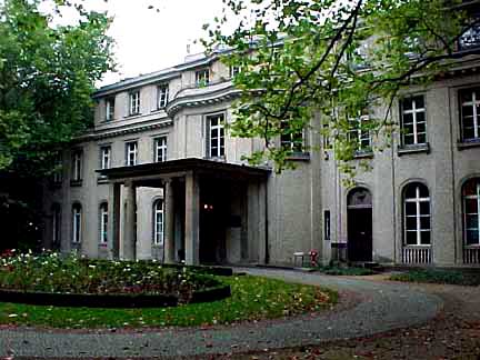 Wannsee Conference 20 January 1942After World War II ended on May 8, 1945, the Allied powers began a search for the Nazi documents that they would need as evidence at the Nuremberg International Military Tribunal which was set to begin in November 1945. They found tons of paperwork including secret documents hidden in salt mines and behind walls in the Nazi administration buildings. But the one most important document, the order signed by Adolf Hitler which gave the authority for the genocide of the Jews, was never found. Finally, in 1947, long after the first proceedings of the Nuremberg IMT had ended, the minutes of a conference held on January 20, 1942 at a villa in Wannsee, a district of Berlin, were found. At this conference, the plans for the "Final Solution to the Jewish Question" had been discussed. Today, tourists can stand in the very room where the plans were made for the genocide of the Jews. The photograph above shows the front of the Wannsee villa, as you approach from a short straight driveway off a street named Am Grossen Wannsee. (Wannsee is pronounced VON-say.) The property has now been converted into a Holocaust Museum, which opened in 1992 on the fiftieth anniversary of the conference. The photograph below shows the circular driveway and the miniature roses in the front of the house. Fifteen top officials of the Nazi bureaucracy and the SS attended the Wannsee conference, which was led by 38-year-old Obergruppenführer Reinhard Heydrich, the chief of the Reich Security Main Office (RSHA). On May 27, 1942, Reinhard Heydrich was wounded when a group of Czech resistance fighters, who had escaped to England, returned and made an attempt on his life in Prague. Heydrich died of his wounds on June 4, 1942. The minutes or protocols of the Wannsee meeting, 15 pages in all, were written by 36-year-old Adolf Eichmann. The copy that was found in 1947 was undated and unsigned; it had no stamp of any Bureau. The copy appeared to be a draft report of the meeting that was held on January 20, 1942 at Wannsee. The full title of the Conference was "The Final Solution of the Jewish Question in Europe." The original phrase was "a final territorial solution of the Jewish question." The term "Jewish Question" referred to a question that had been discussed for years: Should the Jews have their own state within the country where they lived, or should they assimilate? On the witness stand at the Nuremberg IMT, Hermann Goering said that the conference was about "the total solution to the Jewish Question" and that it meant the evacuation of the Jews, not extermination. The full text of the letter from Goering to Heydrich, ordering the Final Solution, (Nuremberg Document PS-710) is quoted below: To the Chief of the Security Police and the SD, SS Gruppenfuehrer Heydrich Berlin In completion of the task which was entrusted to you in the Edict dated January 24, 1939, of solving the Jewish question by means of emigration or evacuation in the most convenient way possible, given the present conditions, I herewith charge you with making all necessary preparations with regard to organizational, practical and financial aspects for a total solution [Gesamtloesung] of the Jewish question in the German sphere of influence in Europe. Insofar as the competencies of other central organizations are affected, these are to be involved. I further charge you with submitting to me promptly an overall plan of the preliminary organizational, practical and financial measures for the execution of the intended final solution (Endloesung) of the Jewish question. Goering In 1992, Yehuda Bauer, a professor at Hebrew University in Jerusalem, referred to "the silly story of Wannsee," as he said: "The public still repeats, time after time, the silly story that at Wannsee the extermination of the Jews was arrived at." The fifteen men who met at Wannsee for this historic occasion were not elder statesmen, but men in their prime, who were, for the most part, long standing members of the Nazi party. Heydrich's involvement with the Nazis dated back to the dawn of the Fascist movement in Germany when he was a teen-aged member of the Freikorp, a volunteer militia group which engaged in bloody street battles with the Communists, who were led in Berlin by the Jewish militants, Karl Liebknecht and Rosa Luxembourg, and in Munich by the Jewish leader, Kurt Eisner. The minutes of the meeting began with an explanation of what had been accomplished so far by the emigration of the Jews in Germany, including the German protectorate of Bohemia and Moravia, which is now the Czech Republic. The following quote is from the minutes of the Wannsee conference: The Chief of the Security Police and the SD then gave a short report of the struggle which has been carried on thus far against this enemy, the essential points being the following: a) the expulsion of the Jews from every sphere of life of the German people, b) the expulsion of the Jews from the living space of the German people. In carrying out these efforts, an increased and planned acceleration of the emigration of the Jews from Reich territory was started, as the only possible present solution. By order of the Reich Marshal, a Reich Central Office for Jewish Emigration was set up in January 1939 and the Chief of the Security Police and SD was entrusted with the management. Its most important tasks were a) to make all necessary arrangements for the preparation for an increased emigration of the Jews, b) to direct the flow of emigration, c) to speed the procedure of emigration in each individual case. The aim of all this was to cleanse German living space of Jews in a legal manner. All the offices realized the drawbacks of such enforced accelerated emigration. For the time being they had, however, tolerated it on account of the lack of other possible solutions of the problem. The Jews had been forced to pay for their emigration themselves. Foreign Jews had donated approximately 9.5 million dol