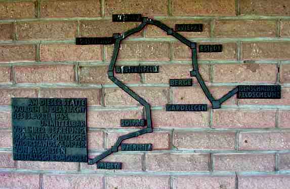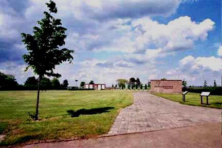 Gardelegen Memorial Site![]() In 1950, the construction and landscaping of a Memorial Site at Gardelegen began in the area near the military cemetery. The barn was torn down, except for part of one wall which was used for the memorial shown in the photo above. What you see in the photo is only half of the front wall of the barn. The length of the barn was twice this long with two doors in the front and two doors in the back. The completed Memorial Site was inaugurated in 1953. It included a line of trees behind the wall, but only two of them were still there in May 2002. The military cemetery is behind the camera and to the left in this photo. The view of the barn from the cemetery is now obstructed by trees planted, in honor of the victims, in the former grain field. ![]() An overall view of the Memorial Site in the photo above shows a wide path leading past a three-sided brick building on the right, then past some memorial stones in honor of the countries from which the prisoners came, finally ending at the remains of the front wall of the barn which has been propped up as a memorial. The documentation center which was created at the Memorial Site in 1991 is directly behind the camera in this photo. ![]() Markers which resemble grave stones line the path from the entrance to the memorial wall. Each stone has the name of one of the countries that the prisoners were from: Belgium, France, Poland, the Soviet Union, Italy, Yugoslavia, Mexico, Holland, Czechoslovakia, and Hungary. The stone in the foreground is in honor of prisoners from Mexico who died in the barn. Two of the stones, which were placed here in 1965, have no inscription on them. The building in the background is the documentation center. The prisoners were resistance fighters and partisans who had been captured while fighting as civilians in World War II. They were being evacuated from the concentration camps before the Allied liberators arrived. These were the prisoners that were considered to be the most dangerous to the German civilian population after they were set free. ![]() Midway along the path from the entrance, there is a three-sided empty brick building. A map of the route taken by the prisoners, as they were forced to march from their stalled train to Gardelegen is shown on the wall. The village of Solpke is only 10 kilometers from Gardelegen by rail but the prisoners had to take an alternate route on foot because the tracks had been destroyed by the Allied bombing. ![]() ContinueHome |