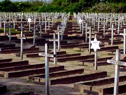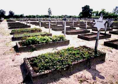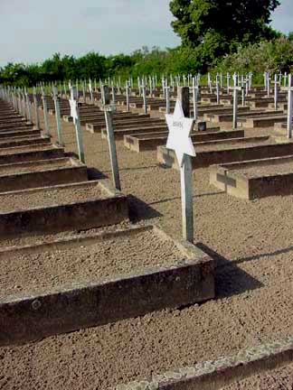 Gardelegen Military Cemetery![]() Almost all of the graves in the Gardelegen Military Cemetery have Christian crosses with the word Unbekannt (unknown) on them. A few are marked with a Jewish Star of David with a prisoner identification number. Only Jewish prisoners, who had been registered at Auschwitz, had their numbers tattooed on their bodies. This photo shows seven Stars of David in a sea of crosses. ![]() Major General Frank Keating ordered that the graves be kept green, and originally the graves were covered with pine boughs by the Gardelegen citizens. In May 2002, all but a few of the graves were covered only by dirt. The dirt paths are raked every morning to wipe away the footprints of visitors. The cemetery looked a bit shabby with the Christian crosses badly in need of paint when I visited in May 2002. Only the Jewish Stars of David had been recently painted. ![]() Only a few of the graves were planted with greenery in May 2002, including the four that are shown in the photo above. The grave in front has the prisoner number of the man who is buried here. None of the markers have names and only a few Jewish graves have identification numbers. Gardelegen is the only place where concentration camp prisoners were ever buried in a military style cemetery. PreviousHome |