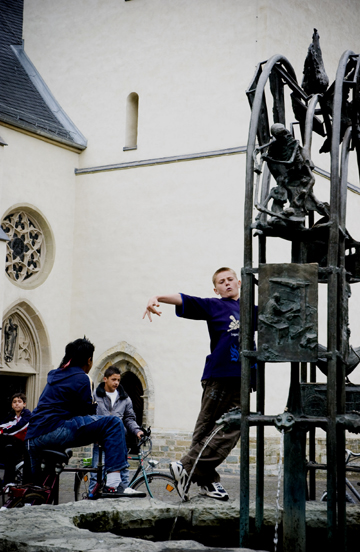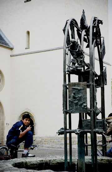 Boy from Geseke poses at historic fountain
