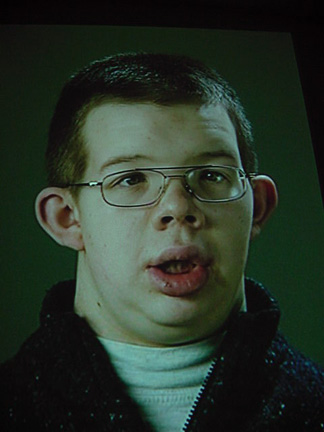 Hartheim Castle Exhibits![]() On display in a glass case in the exhibit area is this very old chair with no wheels in which a handicapped person had to be carried by two people. ![]() The location of the exhibits at Hartheim Castle is indicated by the blue area on the map shown above. Visitors can enter the Memorial Site from two entrances designated by the two red dots. There is an elevator by the entrance shown at the top of the map; the exhibits are on the first two floors of the four-story castle; the two upper floors have seminar rooms. The title of the exhibits at Hartheim Castle is "Wert des lebens" which means "the value of life" in English. This is also the theme of the Memorial Site, which promotes the concept that handicapped students should be mainstreamed in the schools. The exhibits put the issue of the handicapped into a positive perspective; they are shown as being "worthy of life" and as people who should be treated with respect. Before sending each victim into the gas chamber at Hartein Castle, the Nazis took their photograph. Instead of showing the photographs of the pathetic, institutionalized people who were killed at Hartheim, there are present-day photos of 3 handicapped students and two mentally or physically challenged adults who are leading normal lives. Two photos from this exhibit are shown below. ![]()